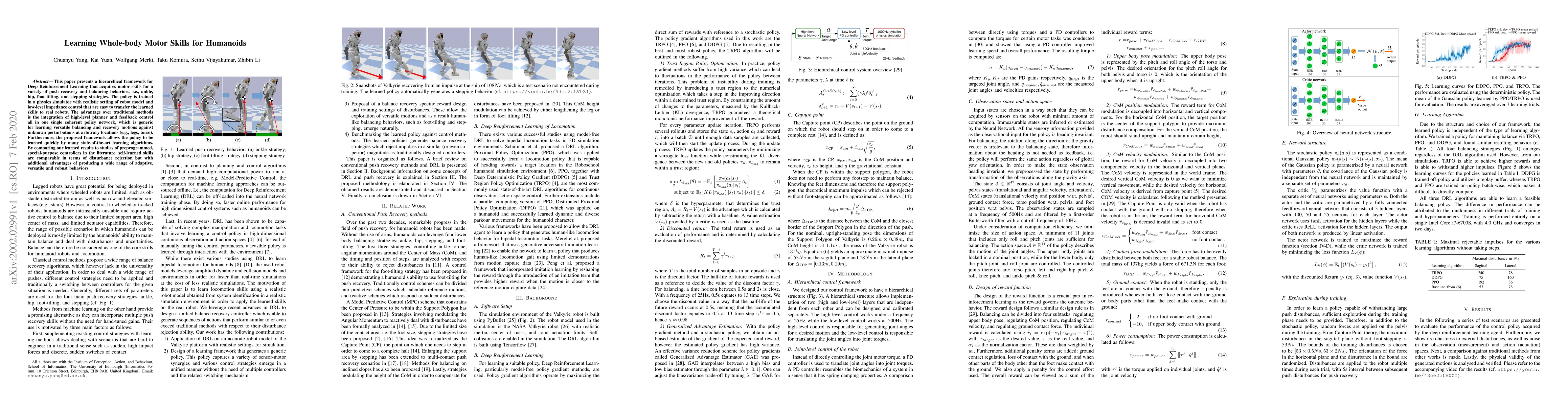 This paper introduces a hierarchical Deep Reinforcement Learning framework for teaching humanoid robots versatile whole-body motor skills, including balancing and push recovery. The method combines high-level planning and low-level control in a single policy network, demonstrating robust adaptability and versatility against various disturbances.