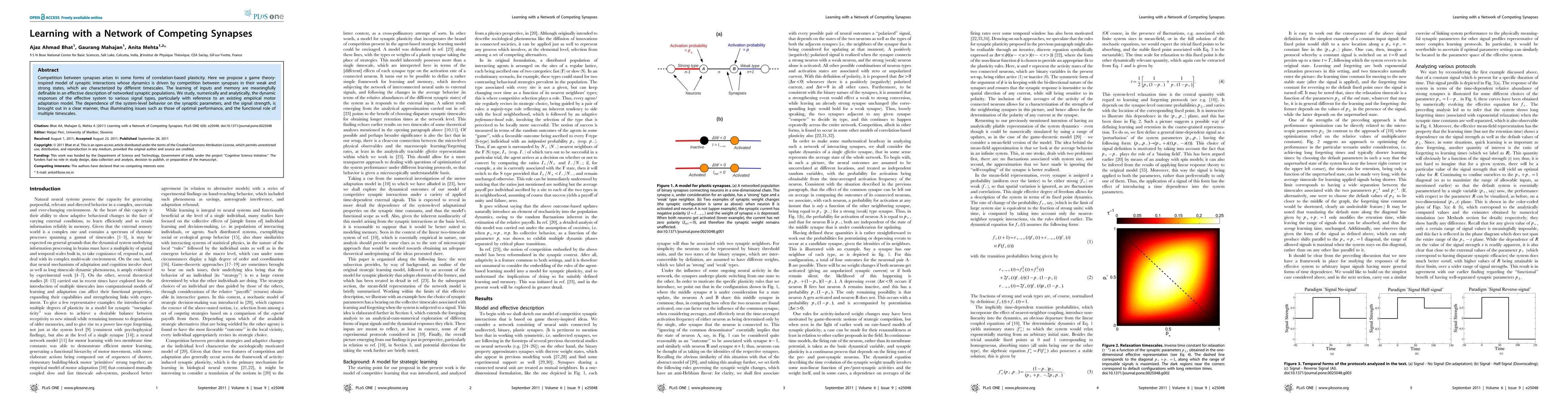 Competition between synapses arises in some forms of correlation-based plasticity. Here we propose a game theory-inspired model of synaptic interactions whose dynamics is driven by competition between synapses in their weak and strong states, which are characterized by different timescales. The learning of inputs and memory are meaningfully definable in an effective description of networked synaptic populations. We study, numerically and analytically, the dynamic responses of the effective system to various signal types, particularly with reference to an existing empirical motor adaptation model. The dependence of the system-level behavior on the synaptic parameters, and the signal strength, is brought out in a clear manner, thus illuminating issues such as those of optimal performance, and the functional role of multiple timescales.
