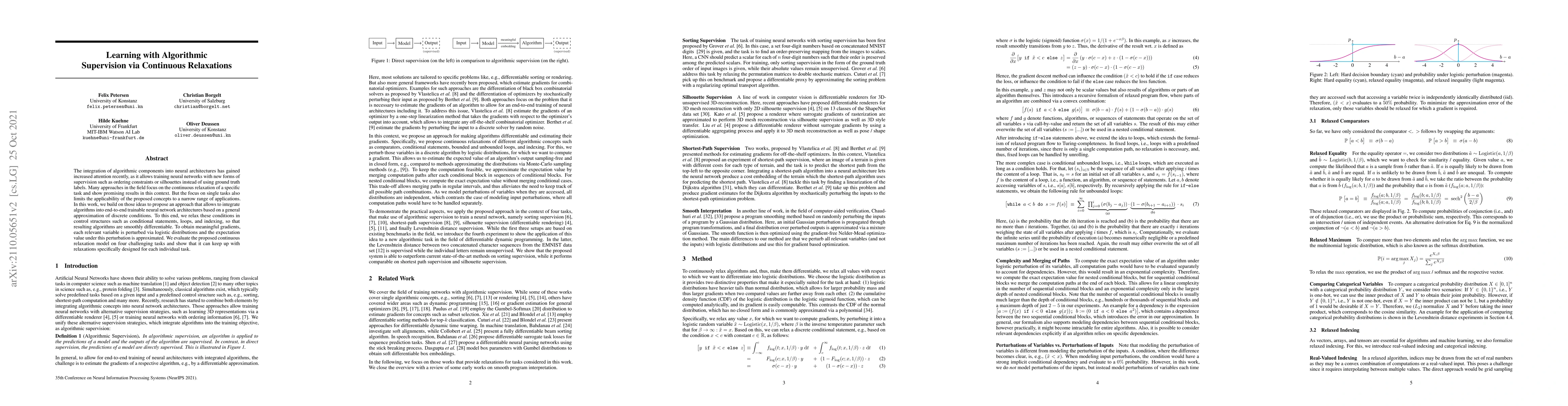 This paper proposes a method to integrate algorithmic components into neural networks through continuous relaxations, enabling training with non-traditional supervision like ordering constraints. The approach differentiates algorithms by relaxing discrete conditions, allowing for end-to-end training and demonstrating competitive performance on four challenging tasks.