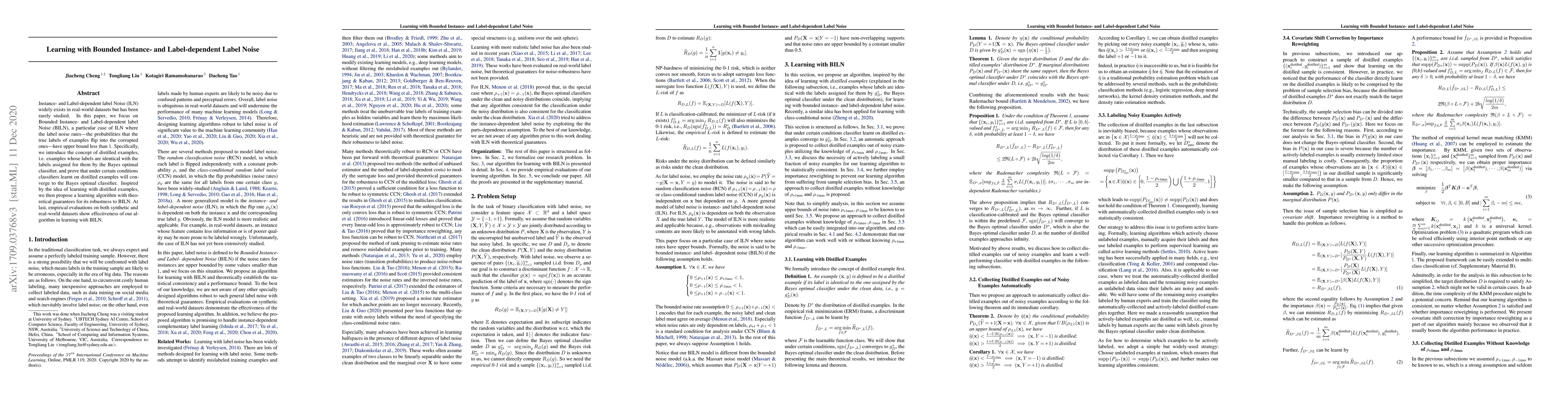 This paper investigates Bounded Instance- and Label-dependent label Noise (BILN) in datasets, proposing a learning algorithm that leverages the concept of distilled examples. The algorithm is theoretically proven to converge to the Bayes optimal classifier under certain conditions, and empirical evaluations demonstrate its effectiveness.
