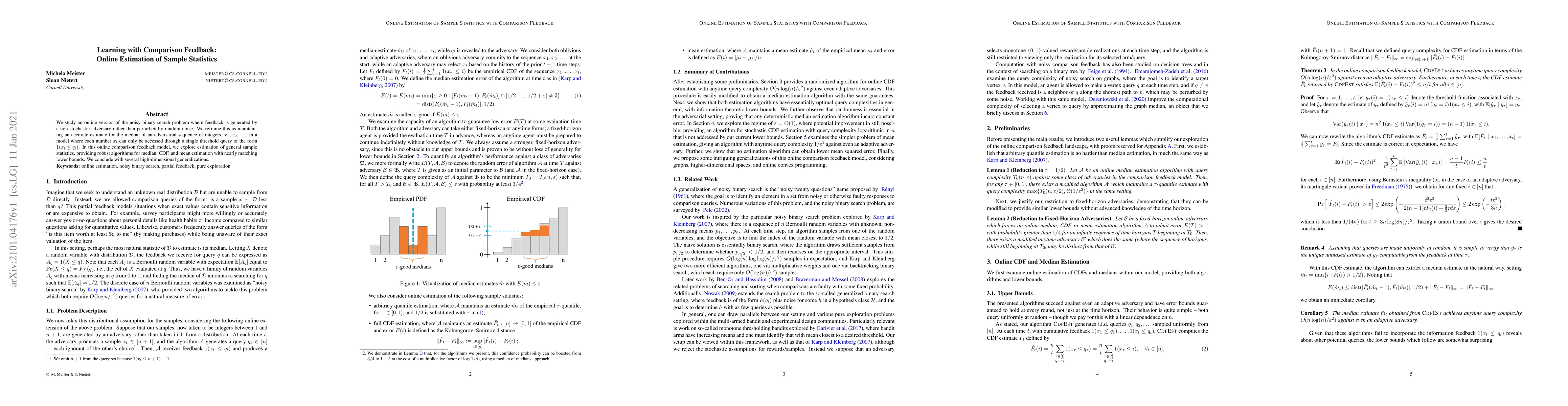 We study an online version of the noisy binary search problem where feedback is generated by a non-stochastic adversary rather than perturbed by random noise. We reframe this as maintaining an accurate estimate for the median of an adversarial sequence of integers, $x_1, x_2, \dots$, in a model where each number $x_t$ can only be accessed through a single threshold query of the form ${1(x_t \leq q_t)}$. In this online comparison feedback model, we explore estimation of general sample statistics, providing robust algorithms for median, CDF, and mean estimation with nearly matching lower bounds. We conclude with several high-dimensional generalizations.
