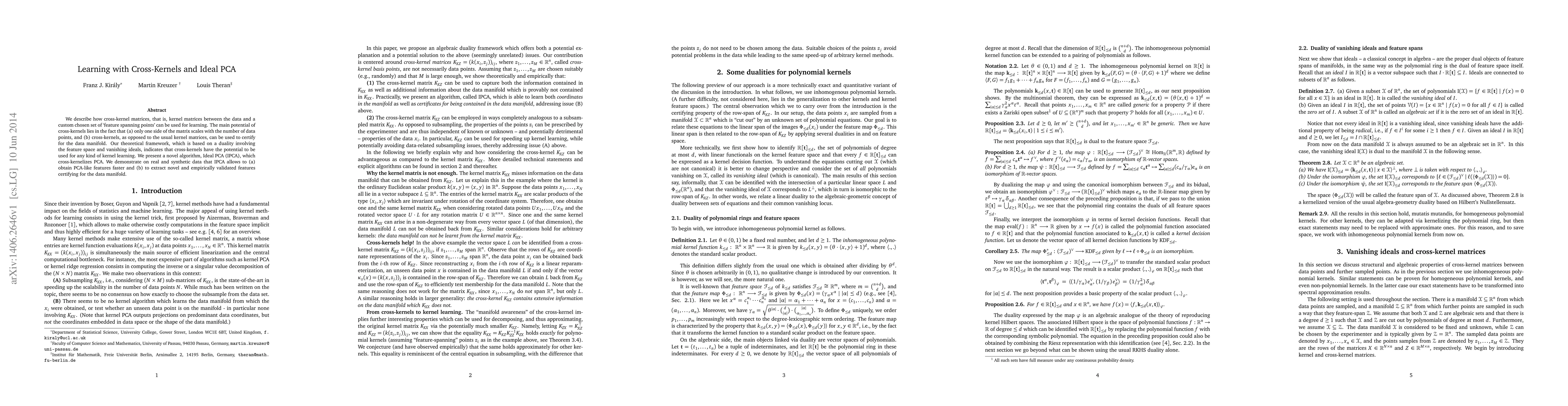We describe how cross-kernel matrices, that is, kernel matrices between the data and a custom chosen set of `feature spanning points' can be used for learning. The main potential of cross-kernels lies in the fact that (a) only one side of the matrix scales with the number of data points, and (b) cross-kernels, as opposed to the usual kernel matrices, can be used to certify for the data manifold. Our theoretical framework, which is based on a duality involving the feature space and vanishing ideals, indicates that cross-kernels have the potential to be used for any kind of kernel learning. We present a novel algorithm, Ideal PCA (IPCA), which cross-kernelizes PCA. We demonstrate on real and synthetic data that IPCA allows to (a) obtain PCA-like features faster and (b) to extract novel and empirically validated features certifying for the data manifold.