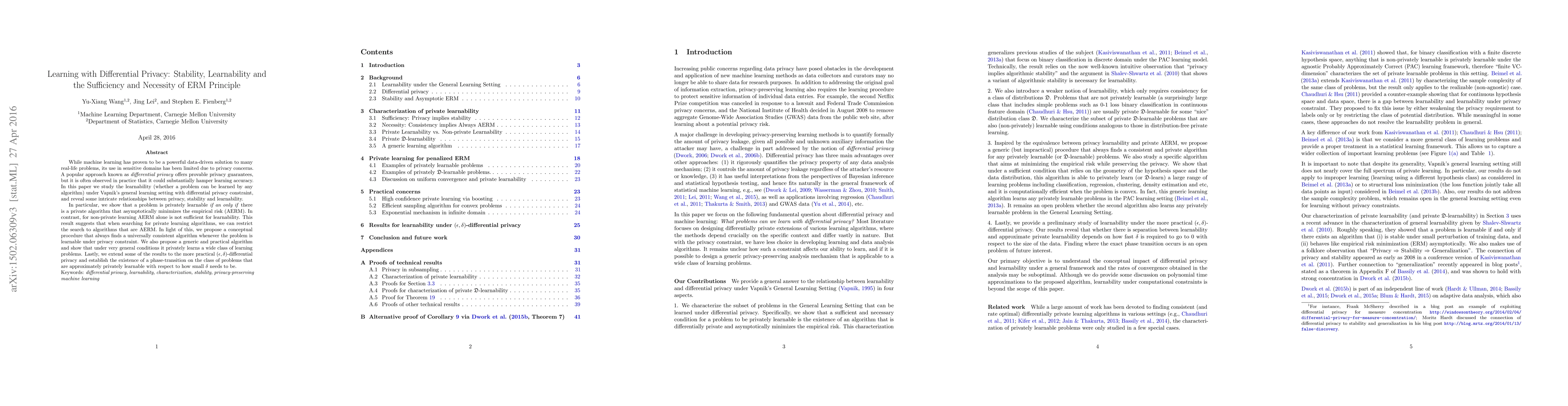 While machine learning has proven to be a powerful data-driven solution to many real-life problems, its use in sensitive domains has been limited due to privacy concerns. A popular approach known as **differential privacy** offers provable privacy guarantees, but it is often observed in practice that it could substantially hamper learning accuracy. In this paper we study the learnability (whether a problem can be learned by any algorithm) under Vapnik's general learning setting with differential privacy constraint, and reveal some intricate relationships between privacy, stability and learnability. In particular, we show that a problem is privately learnable **if an only if** there is a private algorithm that asymptotically minimizes the empirical risk (AERM). In contrast, for non-private learning AERM alone is not sufficient for learnability. This result suggests that when searching for private learning algorithms, we can restrict the search to algorithms that are AERM. In light of this, we propose a conceptual procedure that always finds a universally consistent algorithm whenever the problem is learnable under privacy constraint. We also propose a generic and practical algorithm and show that under very general conditions it privately learns a wide class of learning problems. Lastly, we extend some of the results to the more practical $(\epsilon,\delta)$-differential privacy and establish the existence of a phase-transition on the class of problems that are approximately privately learnable with respect to how small $\delta$ needs to be.