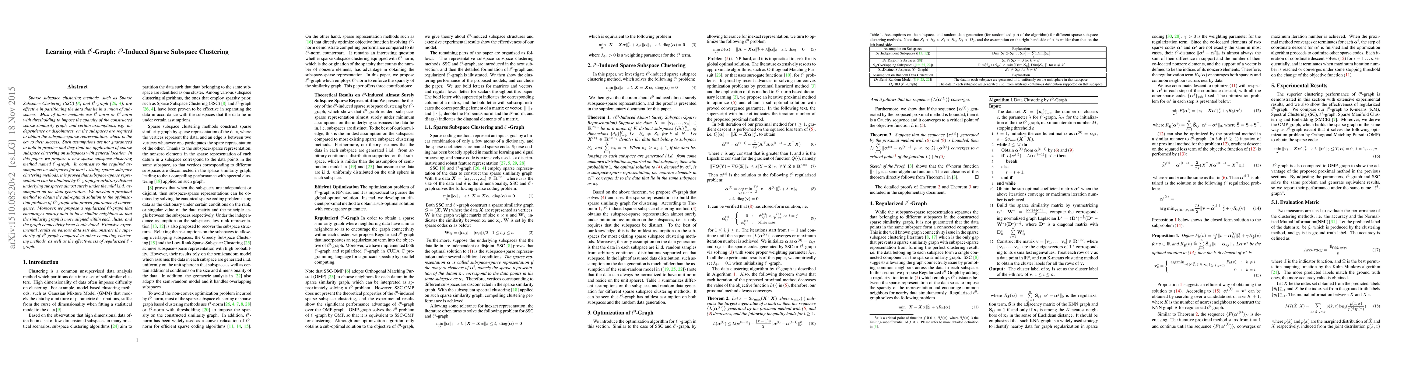 This paper introduces a novel $\ell^{0}$-graph method for sparse subspace clustering, which does not require assumptions like independence or disjointness of subspaces. It demonstrates that $\ell^{0}$-graph can achieve subspace-sparse representation almost surely under mild i.i.d. data generation assumptions, and it presents a proximal method for its optimization with guaranteed convergence.