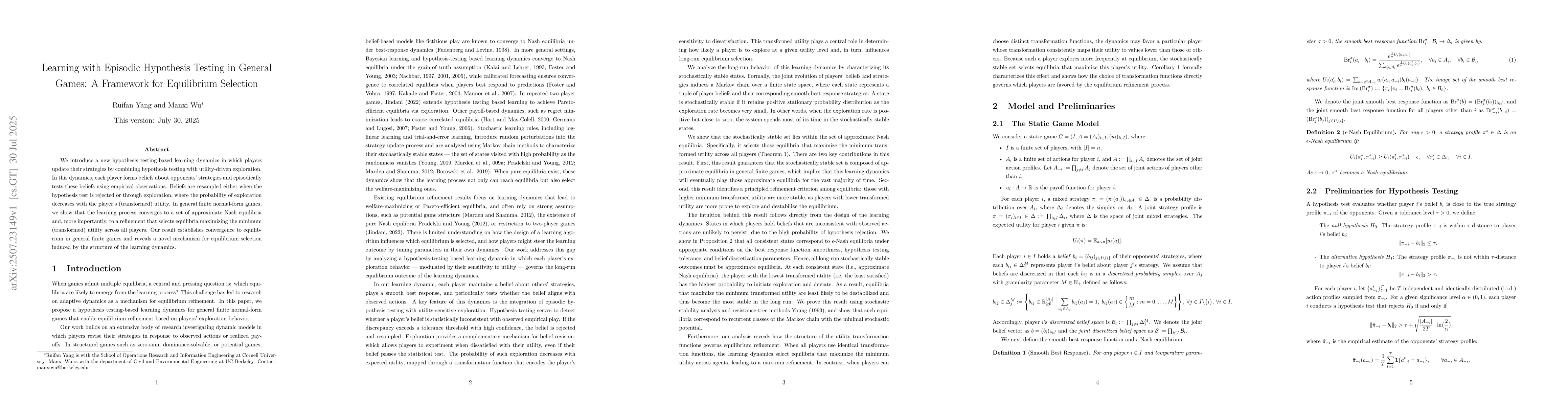 We introduce a new hypothesis testing-based learning dynamics in which players update their strategies by combining hypothesis testing with utility-driven exploration. In this dynamics, each player forms beliefs about opponents' strategies and episodically tests these beliefs using empirical observations. Beliefs are resampled either when the hypothesis test is rejected or through exploration, where the probability of exploration decreases with the player's (transformed) utility. In general finite normal-form games, we show that the learning process converges to a set of approximate Nash equilibria and, more importantly, to a refinement that selects equilibria maximizing the minimum (transformed) utility across all players. Our result establishes convergence to equilibrium in general finite games and reveals a novel mechanism for equilibrium selection induced by the structure of the learning dynamics.