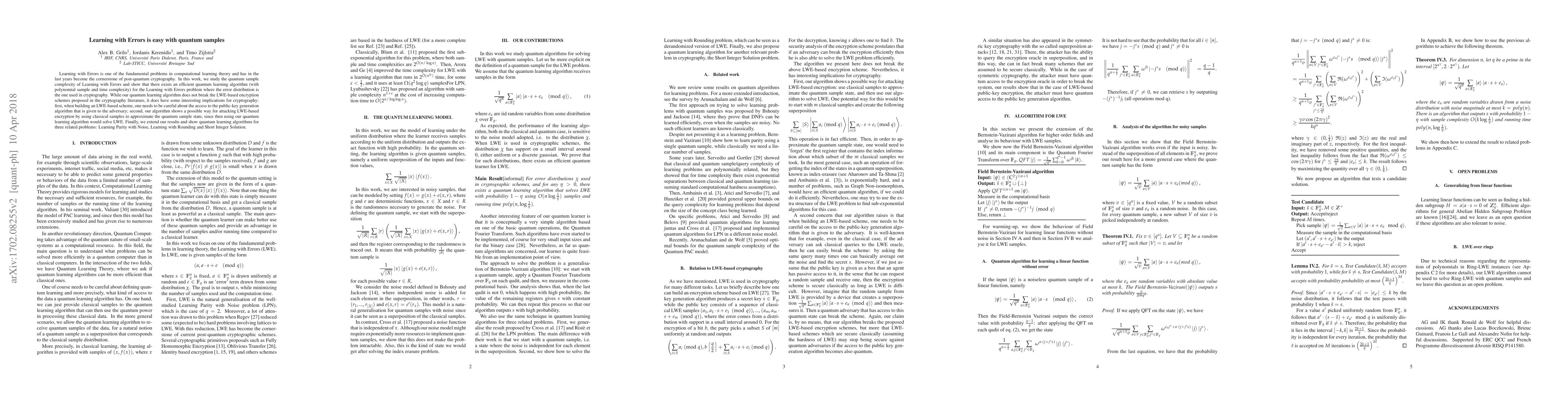 This paper presents an efficient quantum learning algorithm for the Learning with Errors (LWE) problem, demonstrating polynomial sample and time complexity. While it does not break existing LWE-based encryption schemes, it highlights the need for careful access control in scheme construction and suggests a potential attack method using classical samples to approximate quantum states.
