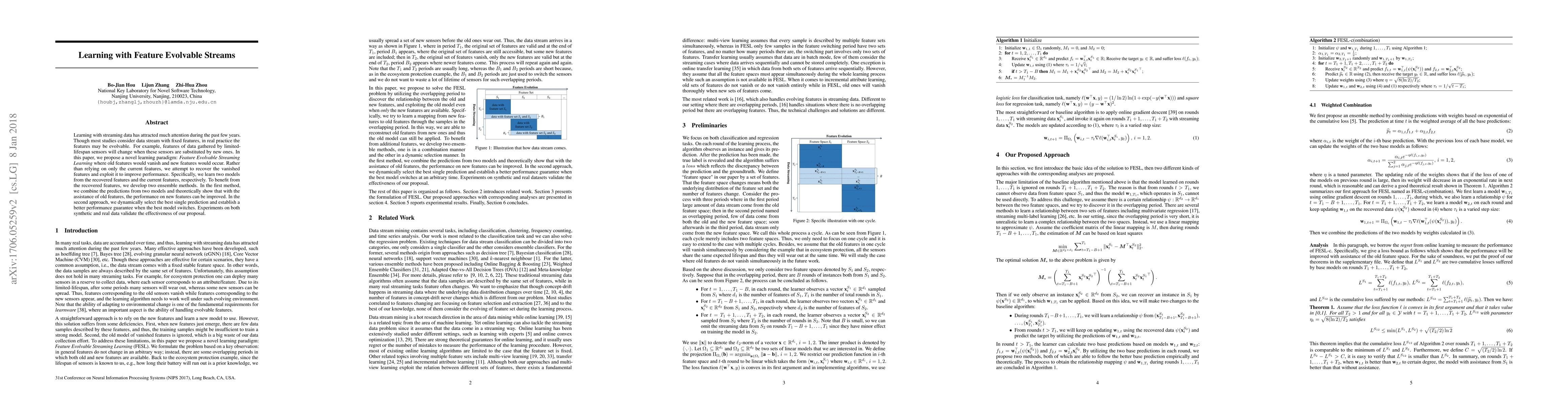 Learning with streaming data has attracted much attention during the past few years. Though most studies consider data stream with fixed features, in real practice the features may be evolvable. For example, features of data gathered by limited-lifespan sensors will change when these sensors are substituted by new ones. In this paper, we propose a novel learning paradigm: \emph{Feature Evolvable Streaming Learning} where old features would vanish and new features would occur. Rather than relying on only the current features, we attempt to recover the vanished features and exploit it to improve performance. Specifically, we learn two models from the recovered features and the current features, respectively. To benefit from the recovered features, we develop two ensemble methods. In the first method, we combine the predictions from two models and theoretically show that with the assistance of old features, the performance on new features can be improved. In the second approach, we dynamically select the best single prediction and establish a better performance guarantee when the best model switches. Experiments on both synthetic and real data validate the effectiveness of our proposal.