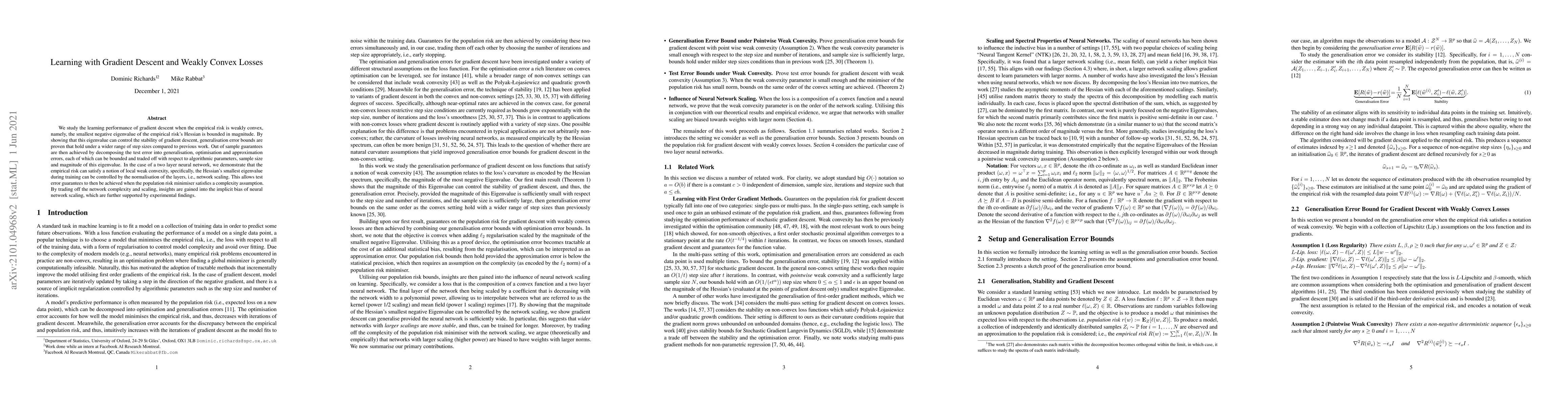 We study the learning performance of gradient descent when the empirical risk is weakly convex, namely, the smallest negative eigenvalue of the empirical risk's Hessian is bounded in magnitude. By showing that this eigenvalue can control the stability of gradient descent, generalisation error bounds are proven that hold under a wider range of step sizes compared to previous work. Out of sample guarantees are then achieved by decomposing the test error into generalisation, optimisation and approximation errors, each of which can be bounded and traded off with respect to algorithmic parameters, sample size and magnitude of this eigenvalue. In the case of a two layer neural network, we demonstrate that the empirical risk can satisfy a notion of local weak convexity, specifically, the Hessian's smallest eigenvalue during training can be controlled by the normalisation of the layers, i.e., network scaling. This allows test error guarantees to then be achieved when the population risk minimiser satisfies a complexity assumption. By trading off the network complexity and scaling, insights are gained into the implicit bias of neural network scaling, which are further supported by experimental findings.
