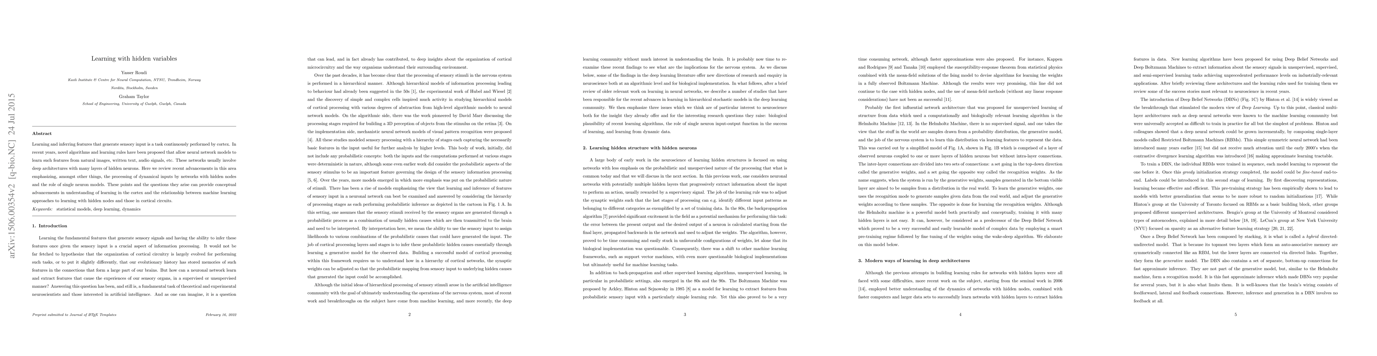 Learning and inferring features that generate sensory input is a task continuously performed by cortex. In recent years, novel algorithms and learning rules have been proposed that allow neural network models to learn such features from natural images, written text, audio signals, etc. These networks usually involve deep architectures with many layers of hidden neurons. Here we review recent advancements in this area emphasizing, amongst other things, the processing of dynamical inputs by networks with hidden nodes and the role of single neuron models. These points and the questions they arise can provide conceptual advancements in understanding of learning in the cortex and the relationship between machine learning approaches to learning with hidden nodes and those in cortical circuits.