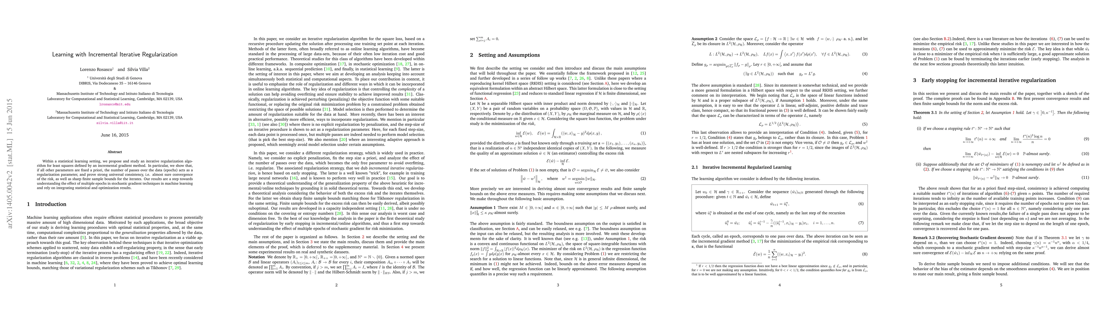 This paper proposes an iterative regularization algorithm for least squares using an incremental gradient method, demonstrating that the number of data passes acts as a regularization parameter. It proves strong universal consistency and sharp finite sample bounds, contributing to the understanding of multiple epochs in stochastic gradient techniques.