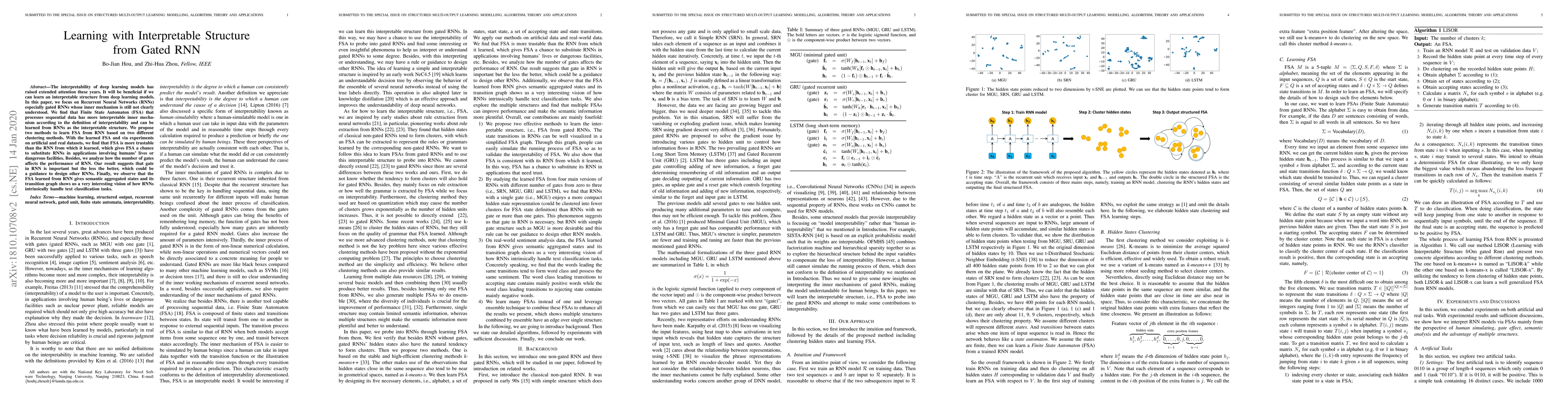 The interpretability of deep learning models has raised extended attention these years. It will be beneficial if we can learn an interpretable structure from deep learning models. In this paper, we focus on Recurrent Neural Networks~(RNNs) especially gated RNNs whose inner mechanism is still not clearly understood. We find that Finite State Automaton~(FSA) that processes sequential data has more interpretable inner mechanism according to the definition of interpretability and can be learned from RNNs as the interpretable structure. We propose two methods to learn FSA from RNN based on two different clustering methods. With the learned FSA and via experiments on artificial and real datasets, we find that FSA is more trustable than the RNN from which it learned, which gives FSA a chance to substitute RNNs in applications involving humans' lives or dangerous facilities. Besides, we analyze how the number of gates affects the performance of RNN. Our result suggests that gate in RNN is important but the less the better, which could be a guidance to design other RNNs. Finally, we observe that the FSA learned from RNN gives semantic aggregated states and its transition graph shows us a very interesting vision of how RNNs intrinsically handle text classification tasks.