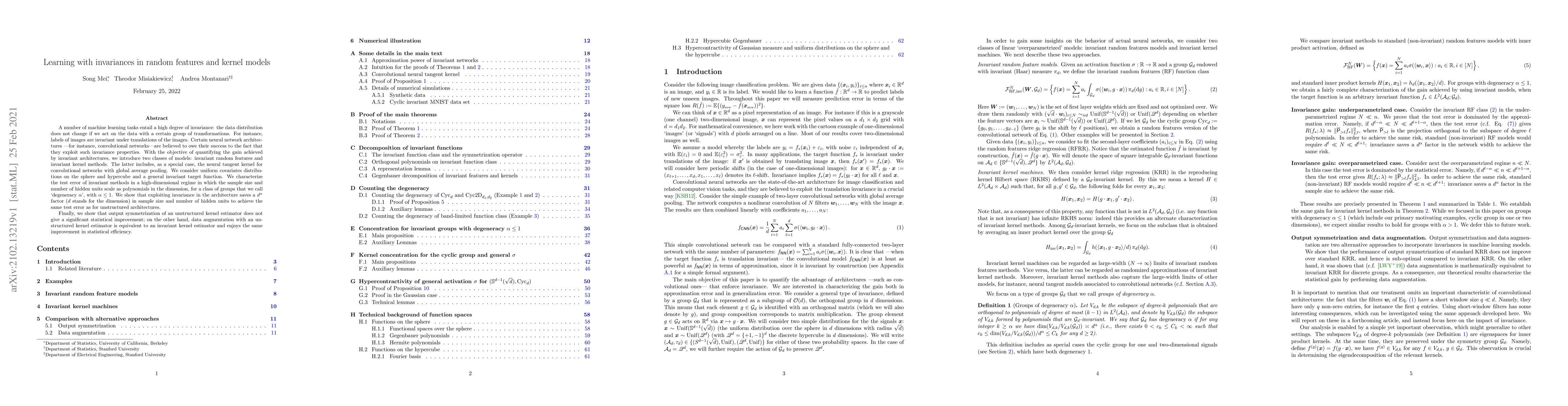 A number of machine learning tasks entail a high degree of invariance: the data distribution does not change if we act on the data with a certain group of transformations. For instance, labels of images are invariant under translations of the images. Certain neural network architectures -- for instance, convolutional networks -- are believed to owe their success to the fact that they exploit such invariance properties. With the objective of quantifying the gain achieved by invariant architectures, we introduce two classes of models: invariant random features and invariant kernel methods. The latter includes, as a special case, the neural tangent kernel for convolutional networks with global average pooling. We consider uniform covariates distributions on the sphere and hypercube and a general invariant target function. We characterize the test error of invariant methods in a high-dimensional regime in which the sample size and number of hidden units scale as polynomials in the dimension, for a class of groups that we call `degeneracy $\alpha$', with $\alpha \leq 1$. We show that exploiting invariance in the architecture saves a $d^\alpha$ factor ($d$ stands for the dimension) in sample size and number of hidden units to achieve the same test error as for unstructured architectures. Finally, we show that output symmetrization of an unstructured kernel estimator does not give a significant statistical improvement; on the other hand, data augmentation with an unstructured kernel estimator is equivalent to an invariant kernel estimator and enjoys the same improvement in statistical efficiency.