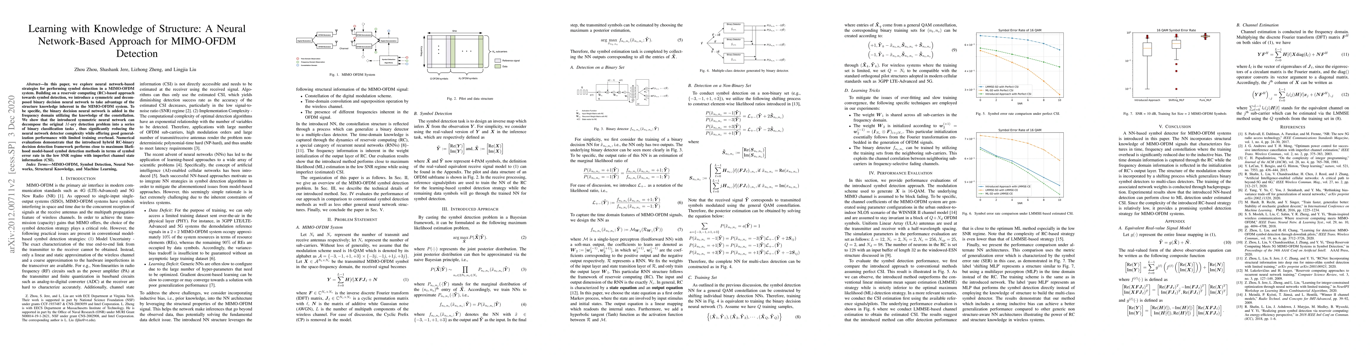 This paper proposes a neural network-based detection method for MIMO-OFDM systems using reservoir computing and a binary decision neural network to exploit structural knowledge. The approach decomposes the $M$-ary detection problem into binary tasks, reducing complexity while maintaining performance.