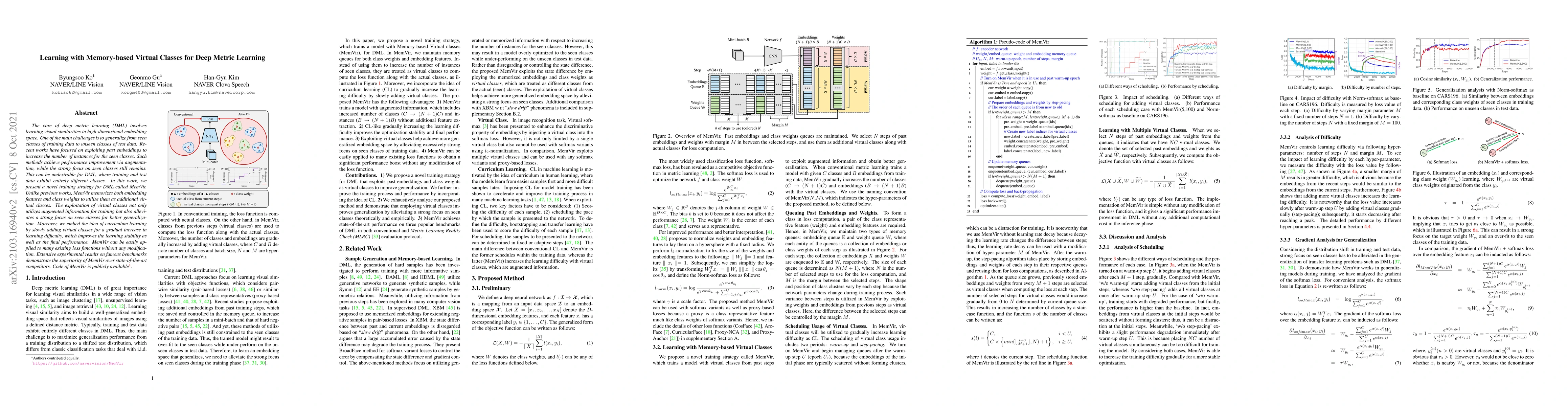 The core of deep metric learning (DML) involves learning visual similarities in high-dimensional embedding space. One of the main challenges is to generalize from seen classes of training data to unseen classes of test data. Recent works have focused on exploiting past embeddings to increase the number of instances for the seen classes. Such methods achieve performance improvement via augmentation, while the strong focus on seen classes still remains. This can be undesirable for DML, where training and test data exhibit entirely different classes. In this work, we present a novel training strategy for DML called MemVir. Unlike previous works, MemVir memorizes both embedding features and class weights to utilize them as additional virtual classes. The exploitation of virtual classes not only utilizes augmented information for training but also alleviates a strong focus on seen classes for better generalization. Moreover, we embed the idea of curriculum learning by slowly adding virtual classes for a gradual increase in learning difficulty, which improves the learning stability as well as the final performance. MemVir can be easily applied to many existing loss functions without any modification. Extensive experimental results on famous benchmarks demonstrate the superiority of MemVir over state-of-the-art competitors. Code of MemVir is publicly available.