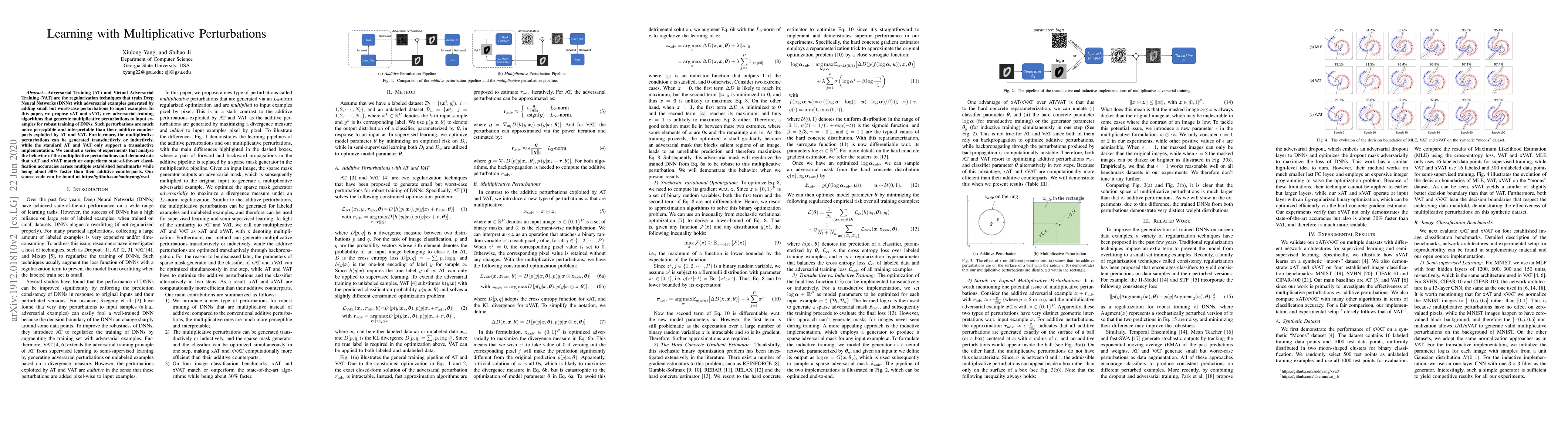 Adversarial Training (AT) and Virtual Adversarial Training (VAT) are the regularization techniques that train Deep Neural Networks (DNNs) with adversarial examples generated by adding small but worst-case perturbations to input examples. In this paper, we propose xAT and xVAT, new adversarial training algorithms, that generate \textbf{multiplicative} perturbations to input examples for robust training of DNNs. Such perturbations are much more perceptible and interpretable than their \textbf{additive} counterparts exploited by AT and VAT. Furthermore, the multiplicative perturbations can be generated transductively or inductively while the standard AT and VAT only support a transductive implementation. We conduct a series of experiments that analyze the behavior of the multiplicative perturbations and demonstrate that xAT and xVAT match or outperform state-of-the-art classification accuracies across multiple established benchmarks while being about 30\% faster than their additive counterparts. Furthermore, the resulting DNNs also demonstrate distinct weight distributions.