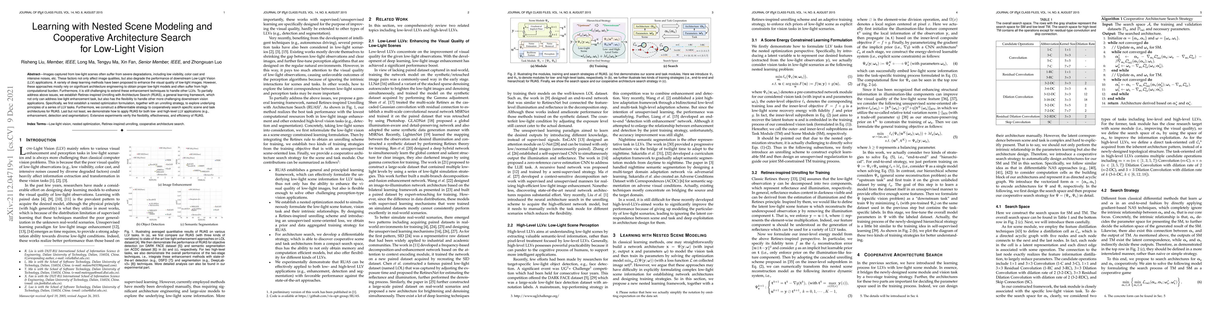 This paper proposes a Retinex-inspired Unrolling with Architecture Search (RUAS) framework for enhancing low-light vision images, addressing issues like low visibility and noise. It employs a nested optimization and cooperative architecture search to improve performance across various low-light vision tasks efficiently.