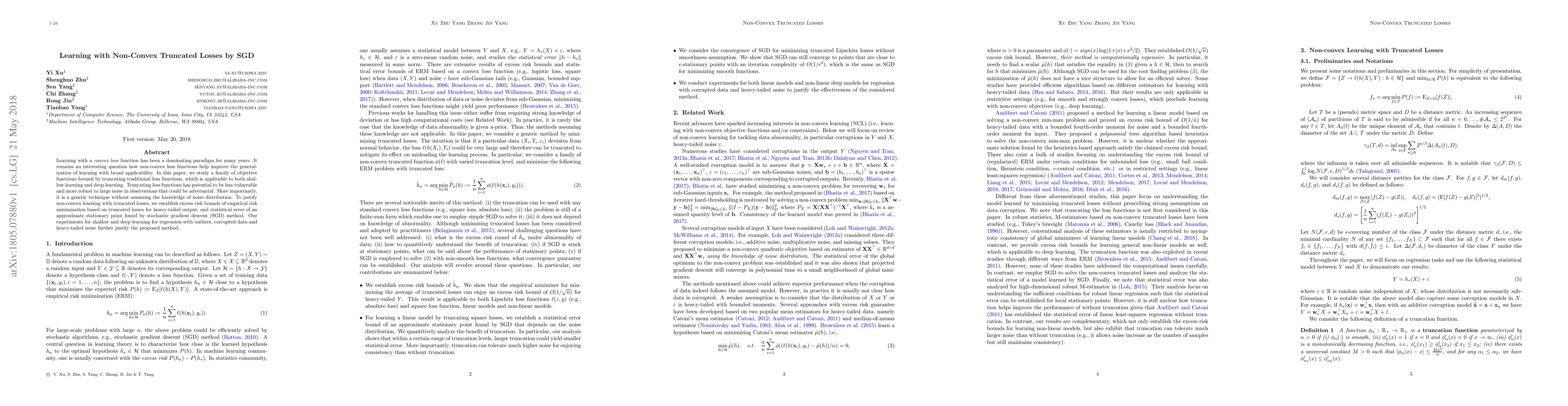 Learning with a {\it convex loss} function has been a dominating paradigm for many years. It remains an interesting question how non-convex loss functions help improve the generalization of learning with broad applicability. In this paper, we study a family of objective functions formed by truncating traditional loss functions, which is applicable to both shallow learning and deep learning. Truncating loss functions has potential to be less vulnerable and more robust to large noise in observations that could be adversarial. More importantly, it is a generic technique without assuming the knowledge of noise distribution. To justify non-convex learning with truncated losses, we establish excess risk bounds of empirical risk minimization based on truncated losses for heavy-tailed output, and statistical error of an approximate stationary point found by stochastic gradient descent (SGD) method. Our experiments for shallow and deep learning for regression with outliers, corrupted data and heavy-tailed noise further justify the proposed method.