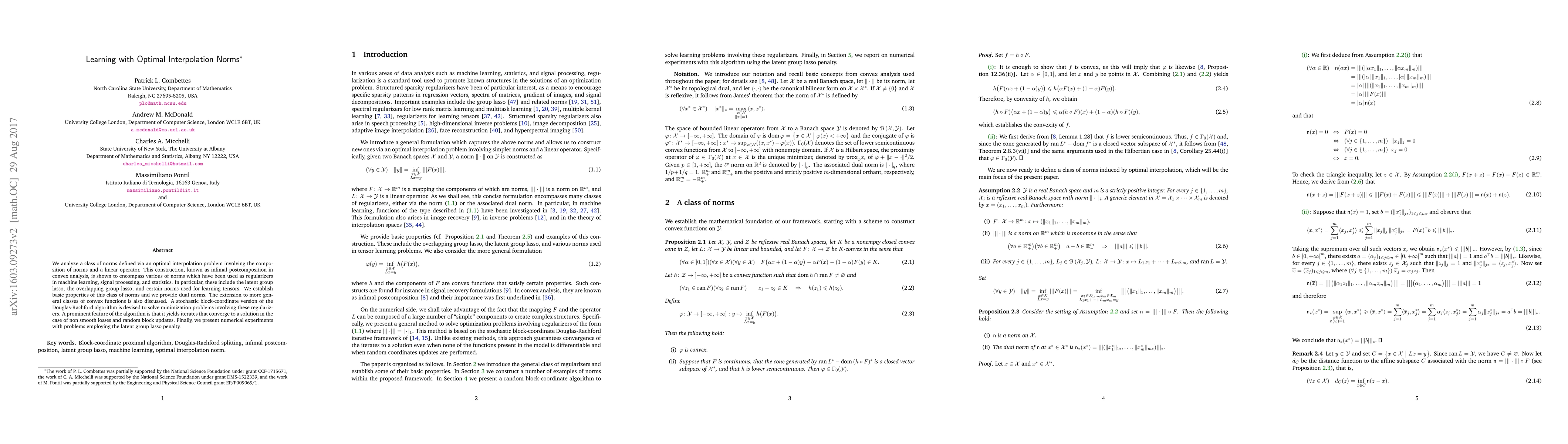 This paper explores norms defined through optimal interpolation, including the latent group lasso and overlapping group lasso, and establishes their properties and dual forms. It introduces a stochastic block-coordinate Douglas-Rachford algorithm for solving related minimization problems, demonstrating convergence even with non-smooth losses and random updates.