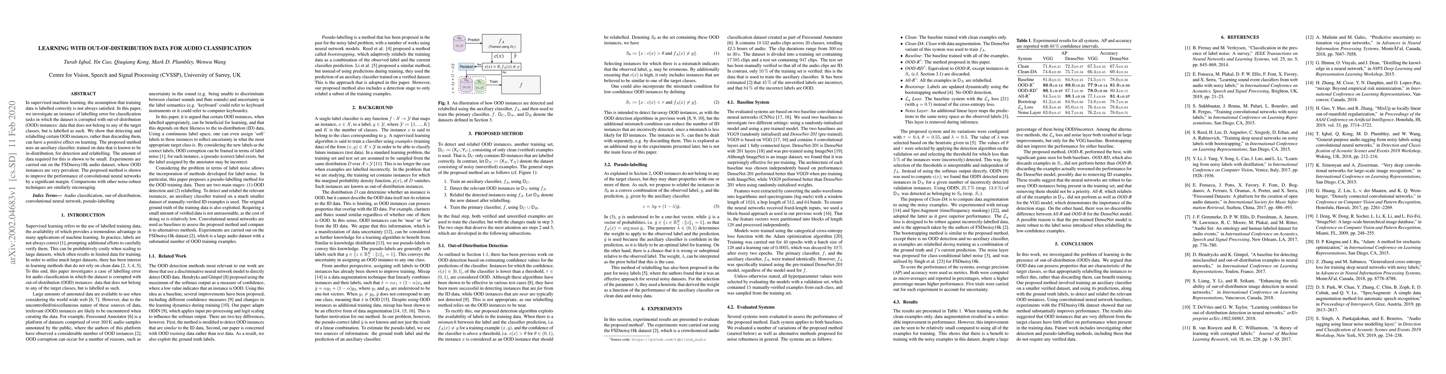 This research paper proposes a method to improve audio classification performance by learning from out-of-distribution data, which are incorrectly labelled instances that do not belong to the target classes. The proposed method is shown to significantly improve convolutional neural network performance on the FSDnoisy18k dataset.
