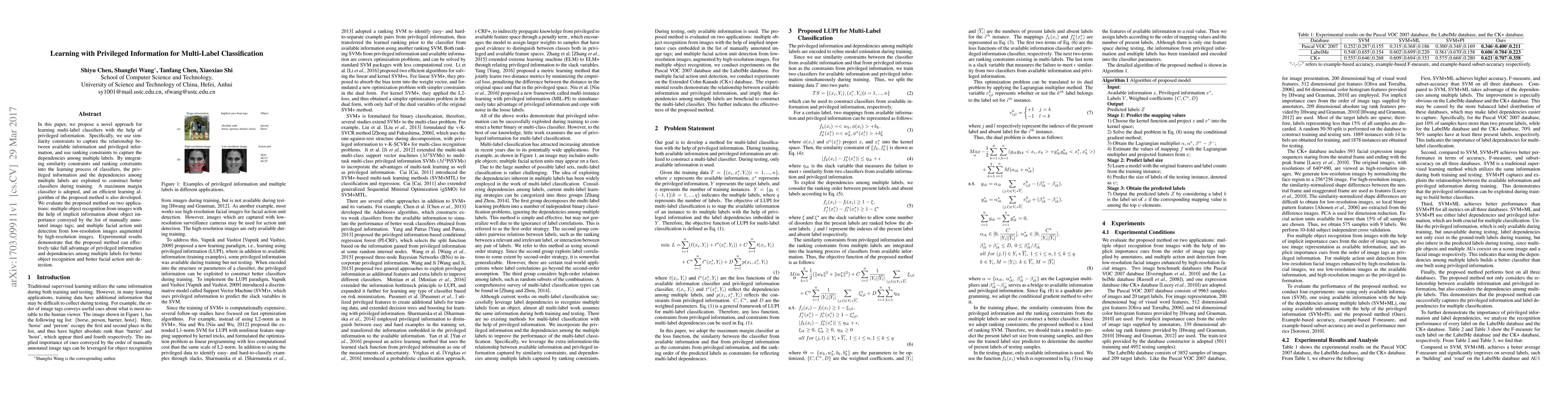 This paper introduces a novel method for multi-label classification using privileged information, leveraging similarity and ranking constraints to exploit relationships and dependencies. The proposed maximum margin classifier, along with an efficient learning algorithm, is shown to improve object recognition and facial action unit detection in experiments.