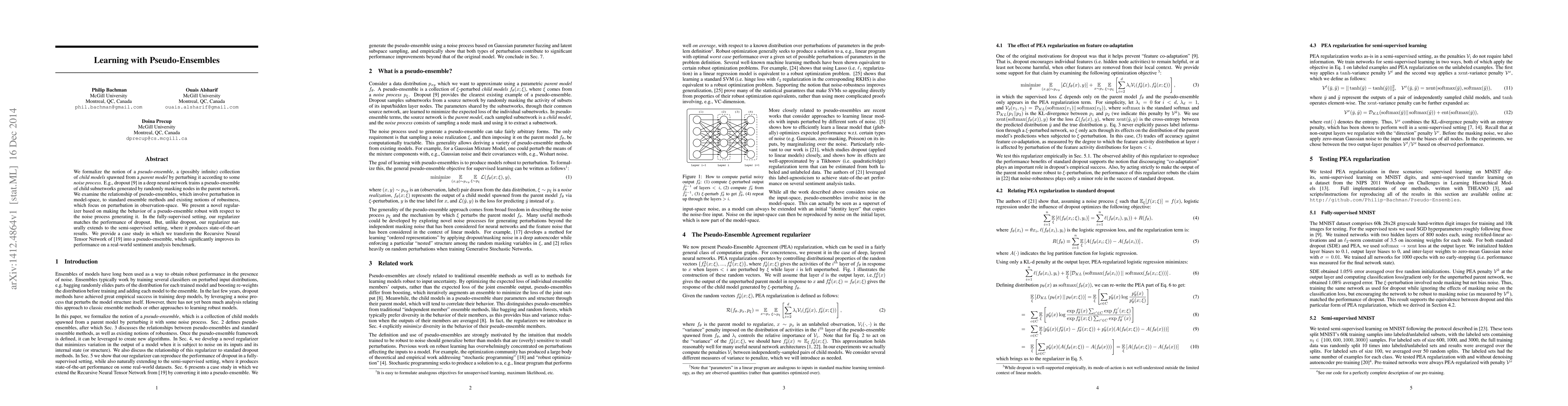 We formalize the notion of a pseudo-ensemble, a (possibly infinite) collection of child models spawned from a parent model by perturbing it according to some noise process. E.g., dropout (Hinton et. al, 2012) in a deep neural network trains a pseudo-ensemble of child subnetworks generated by randomly masking nodes in the parent network. We present a novel regularizer based on making the behavior of a pseudo-ensemble robust with respect to the noise process generating it. In the fully-supervised setting, our regularizer matches the performance of dropout. But, unlike dropout, our regularizer naturally extends to the semi-supervised setting, where it produces state-of-the-art results. We provide a case study in which we transform the Recursive Neural Tensor Network of (Socher et. al, 2013) into a pseudo-ensemble, which significantly improves its performance on a real-world sentiment analysis benchmark.