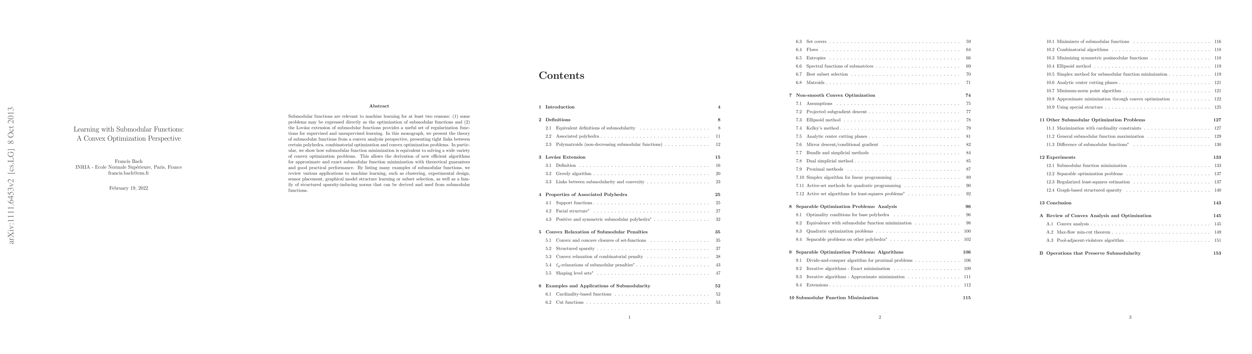 This paper explores the use of submodular functions in machine learning through a convex optimization lens, demonstrating their equivalence to solving various convex optimization problems. It provides new algorithms for submodular function minimization with theoretical guarantees and practical applications in areas like clustering and sensor placement.