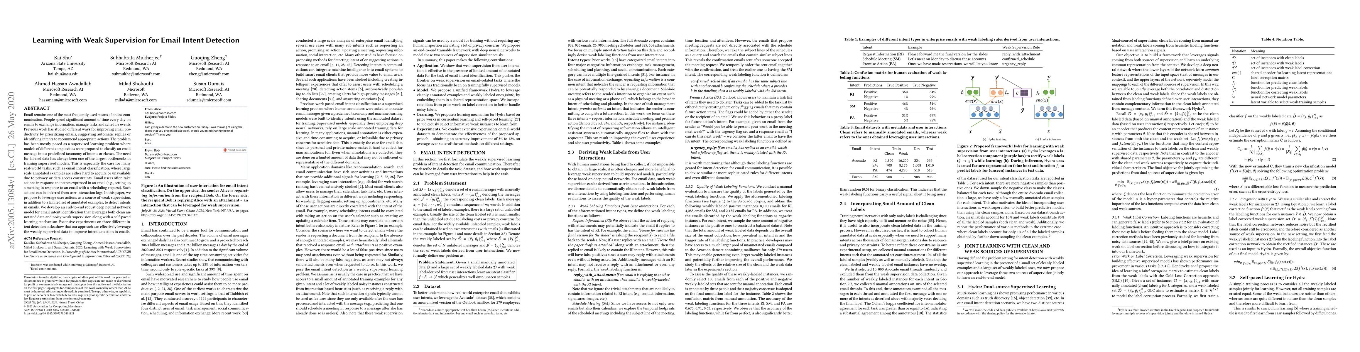 This paper proposes a method to detect email intents using weak supervision from user actions, alongside a limited set of annotated examples, to overcome the challenge of acquiring large labeled datasets. The developed deep neural network model effectively leverages both clean and noisy data, demonstrating improved performance in intent detection tasks.