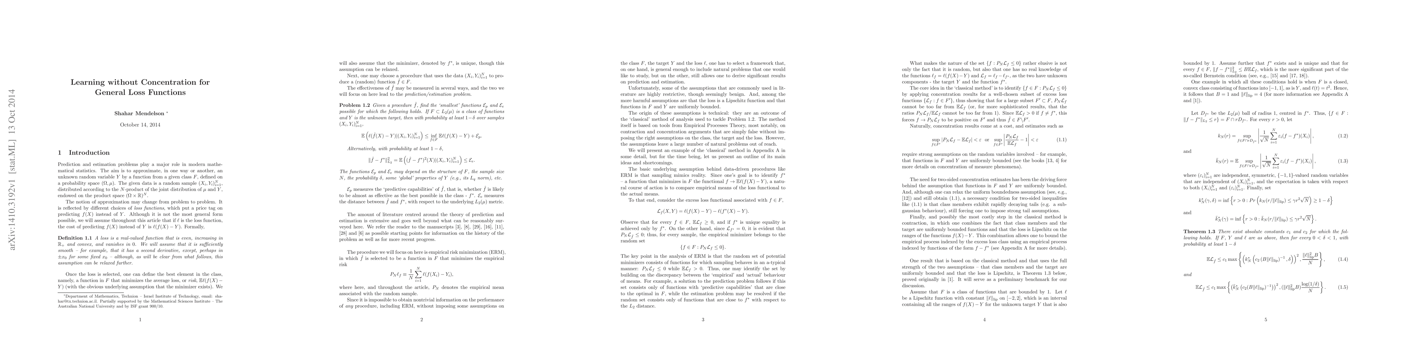 We study prediction and estimation problems using empirical risk minimization, relative to a general convex loss function. We obtain sharp error rates even when concentration is false or is very restricted, for example, in heavy-tailed scenarios. Our results show that the error rate depends on two parameters: one captures the intrinsic complexity of the class, and essentially leads to the error rate in a noise-free (or realizable) problem; the other measures interactions between class members the target and the loss, and is dominant when the problem is far from realizable. We also explain how one may deal with outliers by choosing the loss in a way that is calibrated to the intrinsic complexity of the class and to the noise-level of the problem (the latter is measured by the distance between the target and the class).