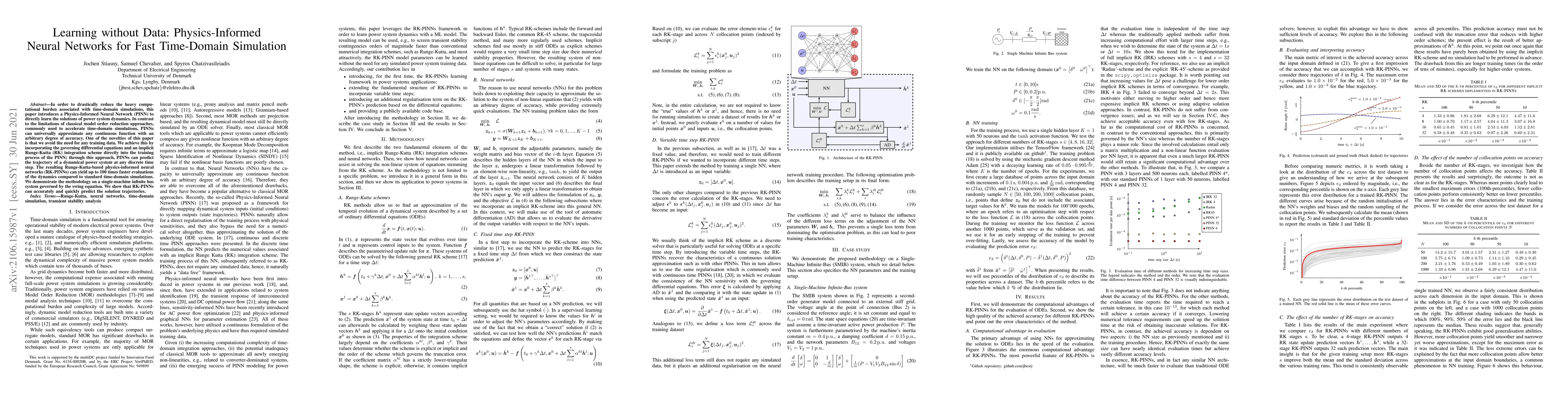 This paper introduces Physics-Informed Neural Networks (PINNs) to accelerate time-domain simulations for power system dynamics without requiring training data. By embedding the governing differential equations and an implicit Runge-Kutta integration scheme into the training process, PINNs achieve up to 100 times faster evaluations compared to standard simulations.