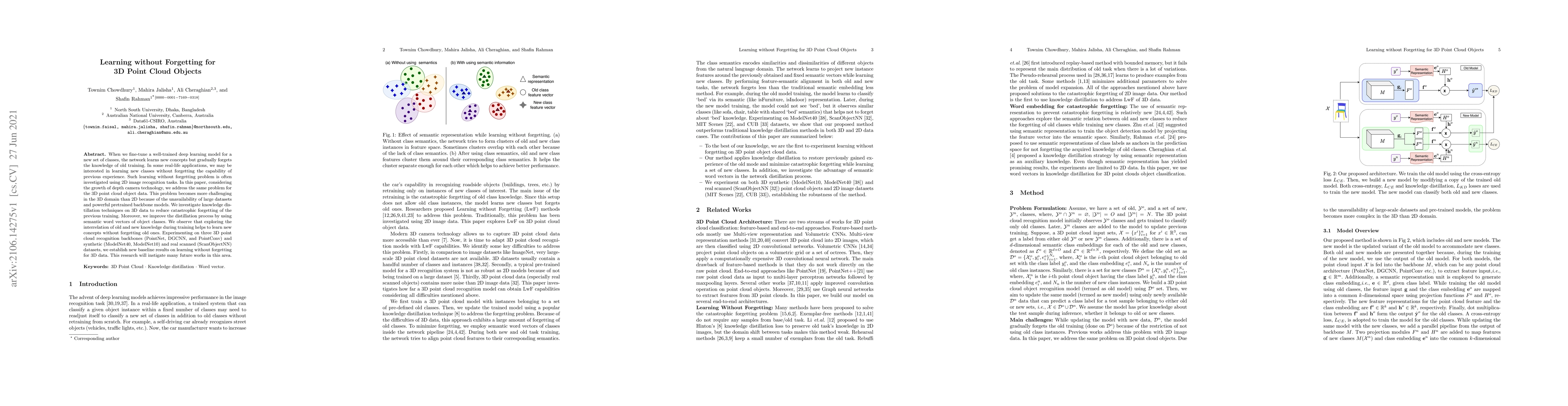When we fine-tune a well-trained deep learning model for a new set of classes, the network learns new concepts but gradually forgets the knowledge of old training. In some real-life applications, we may be interested in learning new classes without forgetting the capability of previous experience. Such learning without forgetting problem is often investigated using 2D image recognition tasks. In this paper, considering the growth of depth camera technology, we address the same problem for the 3D point cloud object data. This problem becomes more challenging in the 3D domain than 2D because of the unavailability of large datasets and powerful pretrained backbone models. We investigate knowledge distillation techniques on 3D data to reduce catastrophic forgetting of the previous training. Moreover, we improve the distillation process by using semantic word vectors of object classes. We observe that exploring the interrelation of old and new knowledge during training helps to learn new concepts without forgetting old ones. Experimenting on three 3D point cloud recognition backbones (PointNet, DGCNN, and PointConv) and synthetic (ModelNet40, ModelNet10) and real scanned (ScanObjectNN) datasets, we establish new baseline results on learning without forgetting for 3D data. This research will instigate many future works in this area.