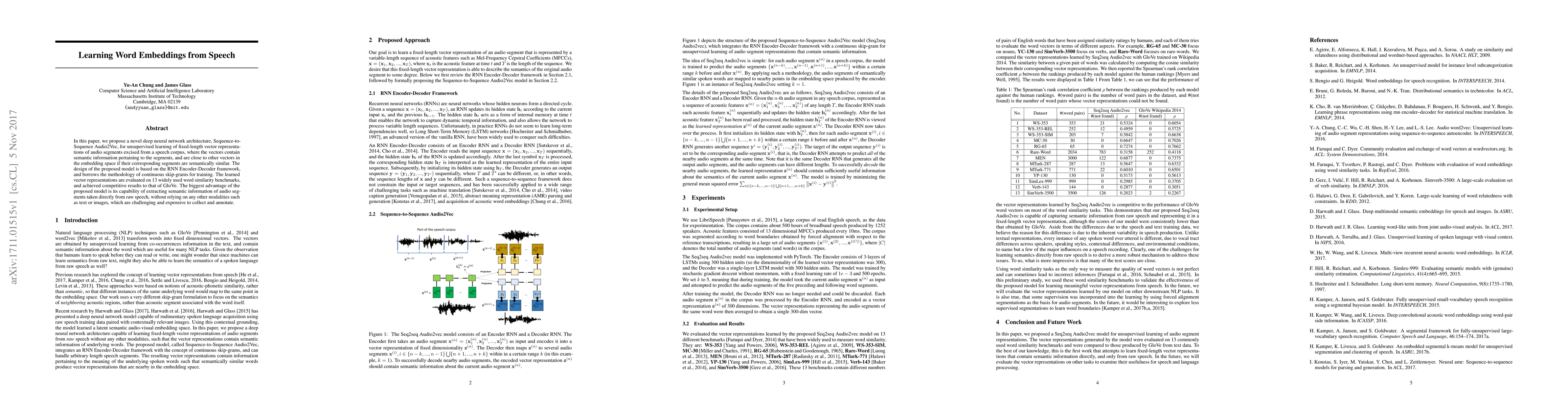 A novel deep neural network architecture learns fixed-length vector representations from audio segments in speech, achieving competitive results with GloVe on 13 word similarity benchmarks. This approach extracts semantic information directly from raw speech without relying on other modalities.