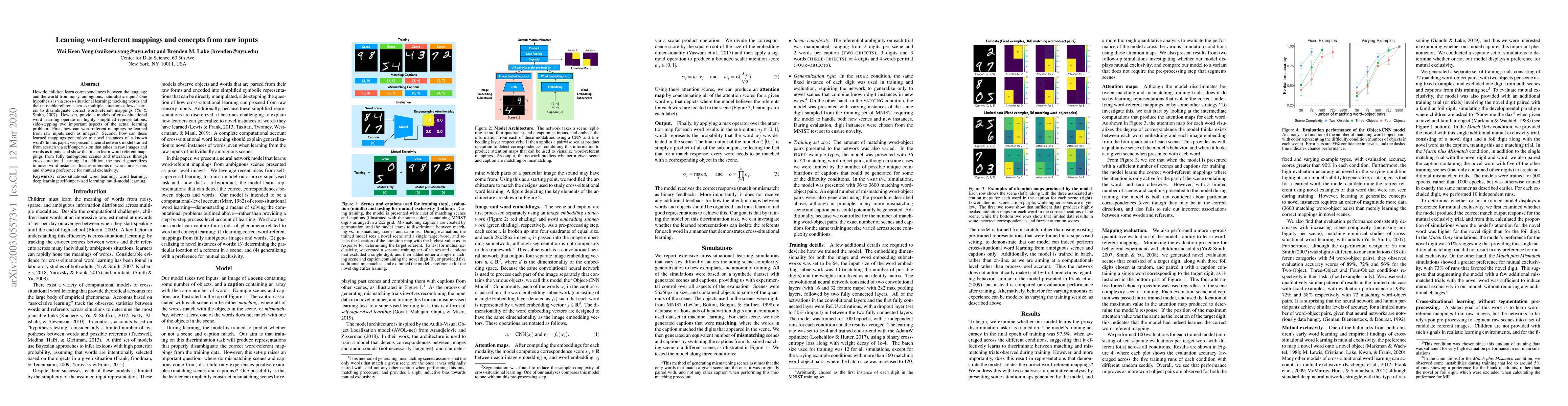 This paper proposes a neural network model that learns word-referent mappings from raw images and words through self-supervised cross-situational learning, demonstrating the ability to generalize to novel instances and locate word referents.