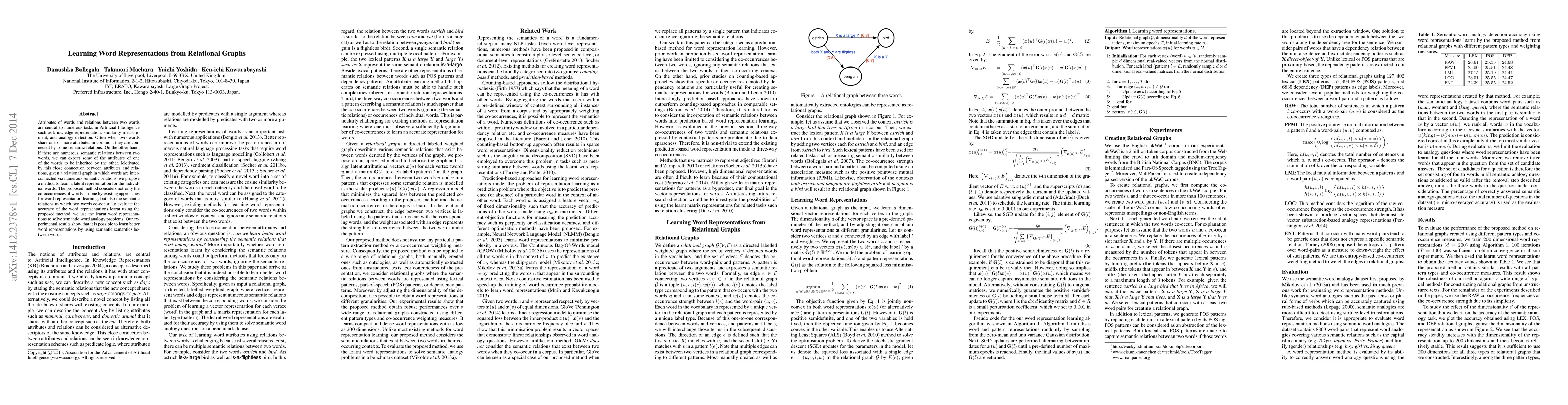This paper proposes a method to learn word representations by incorporating semantic relations between words in a relational graph, beyond just word co-occurrences. The method is evaluated using semantic word analogy tasks, showing improved performance compared to existing co-occurrence-based approaches.