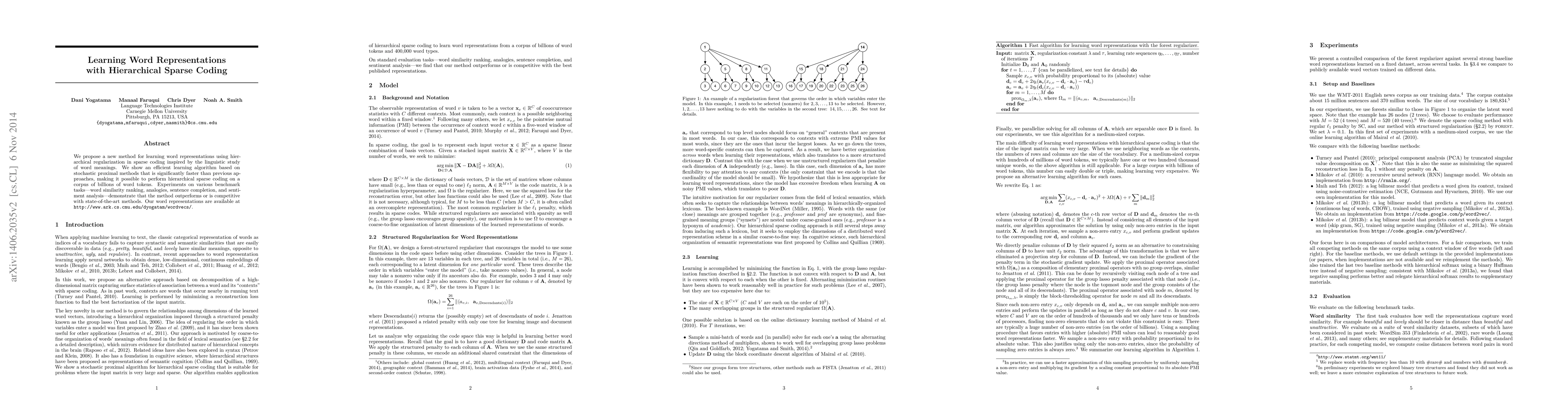 We propose a new method for learning word representations using hierarchical regularization in sparse coding inspired by the linguistic study of word meanings. We show an efficient learning algorithm based on stochastic proximal methods that is significantly faster than previous approaches, making it possible to perform hierarchical sparse coding on a corpus of billions of word tokens. Experiments on various benchmark tasks---word similarity ranking, analogies, sentence completion, and sentiment analysis---demonstrate that the method outperforms or is competitive with state-of-the-art methods. Our word representations are available at \url{http://www.ark.cs.cmu.edu/dyogatam/wordvecs/}.