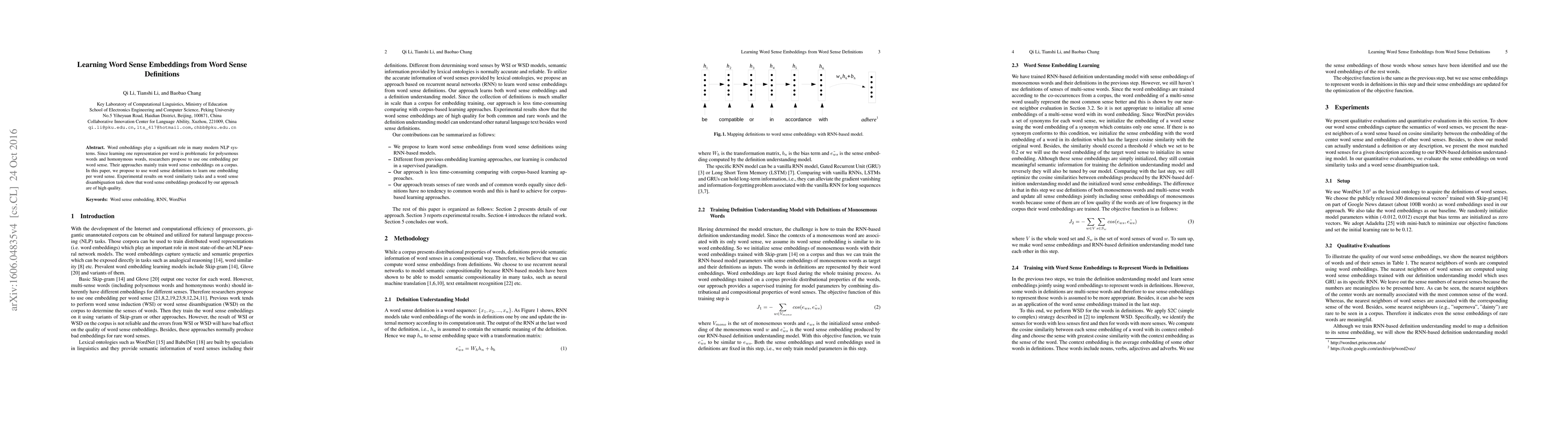 This paper proposes a novel method for learning word sense embeddings using word sense definitions instead of corpora. Experimental results indicate that the resulting embeddings improve performance in word similarity and disambiguation tasks.