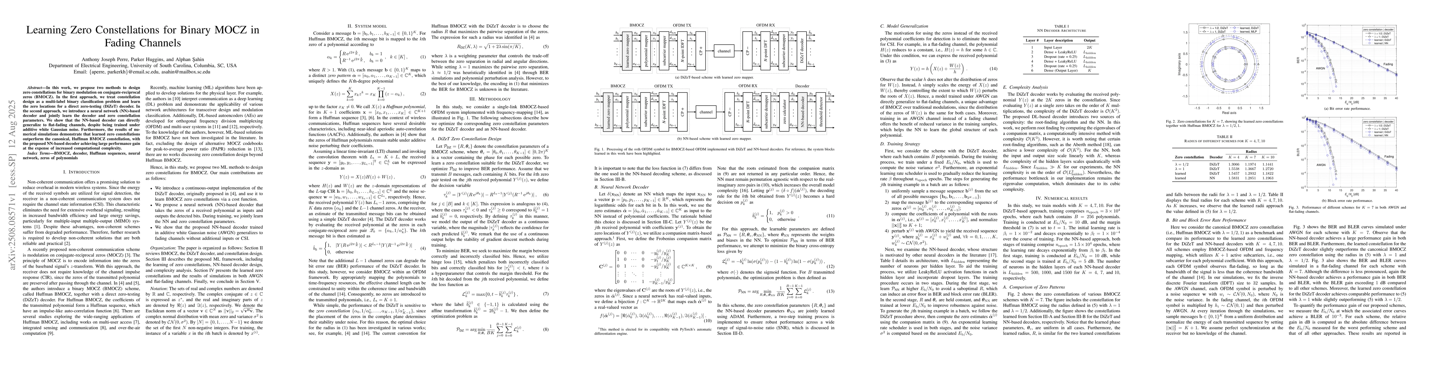 In this work, we propose two methods to design zero constellations for binary modulation on conjugate-reciprocal zeros (BMOCZ). In the first approach, we treat constellation design as a multi-label binary classification problem and learn the zero locations for a direct zero-testing (DiZeT) decoder. In the second approach, we introduce a neural network (NN)-based decoder and jointly learn the decoder and zero constellation parameters. We show that the NN-based decoder can directly generalize to flat-fading channels, despite being trained under additive white Gaussian noise. Furthermore, the results of numerical simulations demonstrate that learned zero constellations outperform the canonical, Huffman BMOCZ constellation, with the proposed NN-based decoder achieving large performance gain at the expense of increased computational complexity.