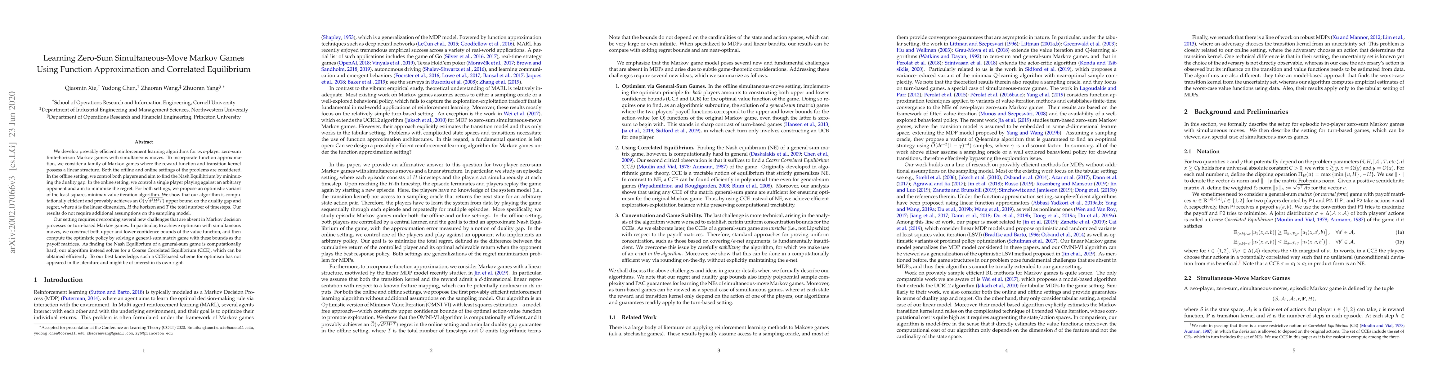 This paper develops efficient reinforcement learning algorithms for two-player zero-sum Markov games with simultaneous moves using function approximation and correlated equilibrium. The proposed algorithm achieves an upper bound on the duality gap and regret, and solves for a Coarse Correlated Equilibrium instead of a computationally hard Nash Equilibrium for general-sum games.
