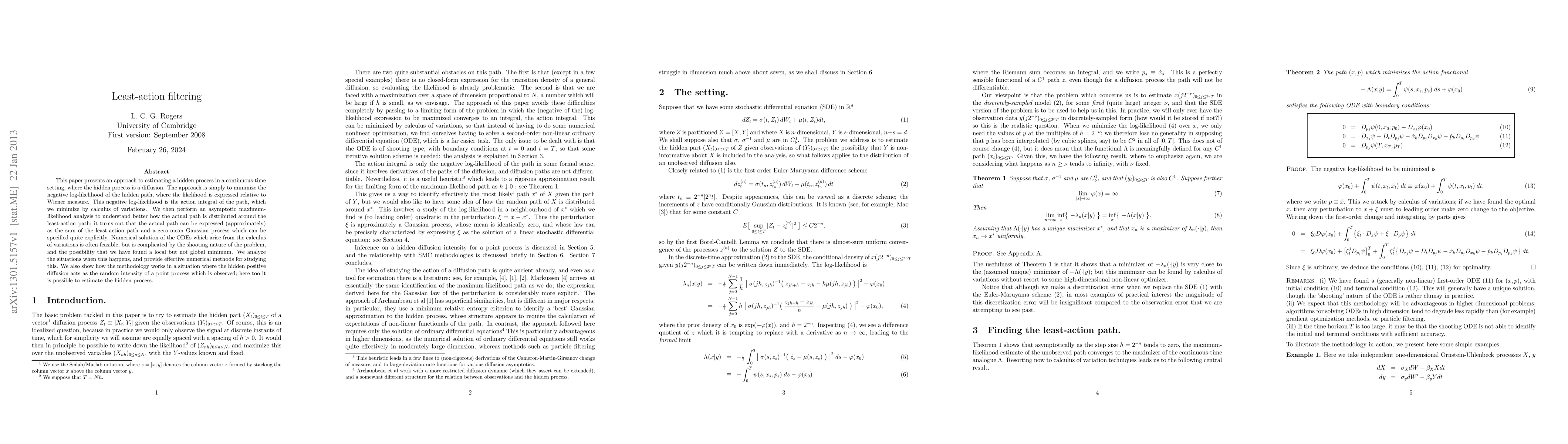 This paper presents an approach to estimating a hidden process in a continuous-time setting, where the hidden process is a diffusion. The approach is simply to minimize the negative log-likelihood of the hidden path, where the likelihood is expressed relative to Wiener measure. This negative log-likelihood is the action integral of the path, which we minimize by calculus of variations. We then perform an asymptotic maximum-likelihood analysis to understand better how the actual path is distributed around the least-action path; it turns out that the actual path can be expressed (approximately) as the sum of the least-action path and a zero-mean Gaussian process which can be specified quite explicitly. Numerical solution of the ODEs which arise from the calculus of variations is often feasible, but is complicated by the shooting nature of the problem, and the possibility that we have found a local but not global minimum. We analyze the situations when this happens, and provide effective numerical methods for studying this. We also show how the methodology works in a situation where the hidden positive diffusion acts as the random intensity of a point process which is observed; here too it is possible to estimate the hidden process.