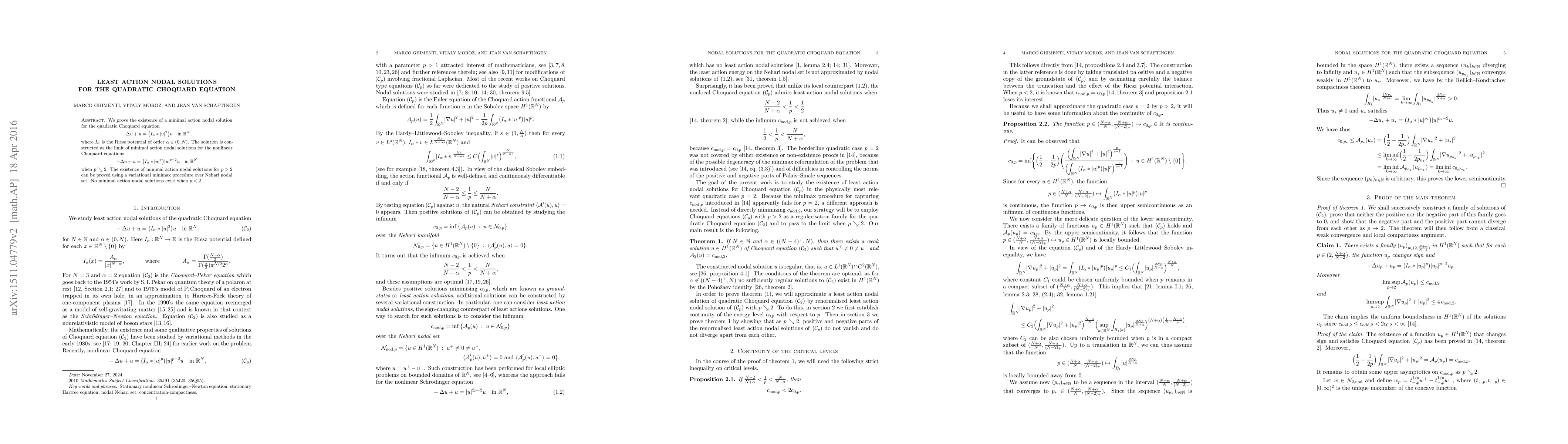 This paper proves the existence of a minimal action nodal solution for the quadratic Choquard equation in $\mathbb{R}^N$ and constructs it as the limit of solutions for nonlinear Choquard equations as $p$ approaches 2. The existence of solutions for $p>2$ is shown via a variational minimax method, while no such solutions exist for $p<2$.