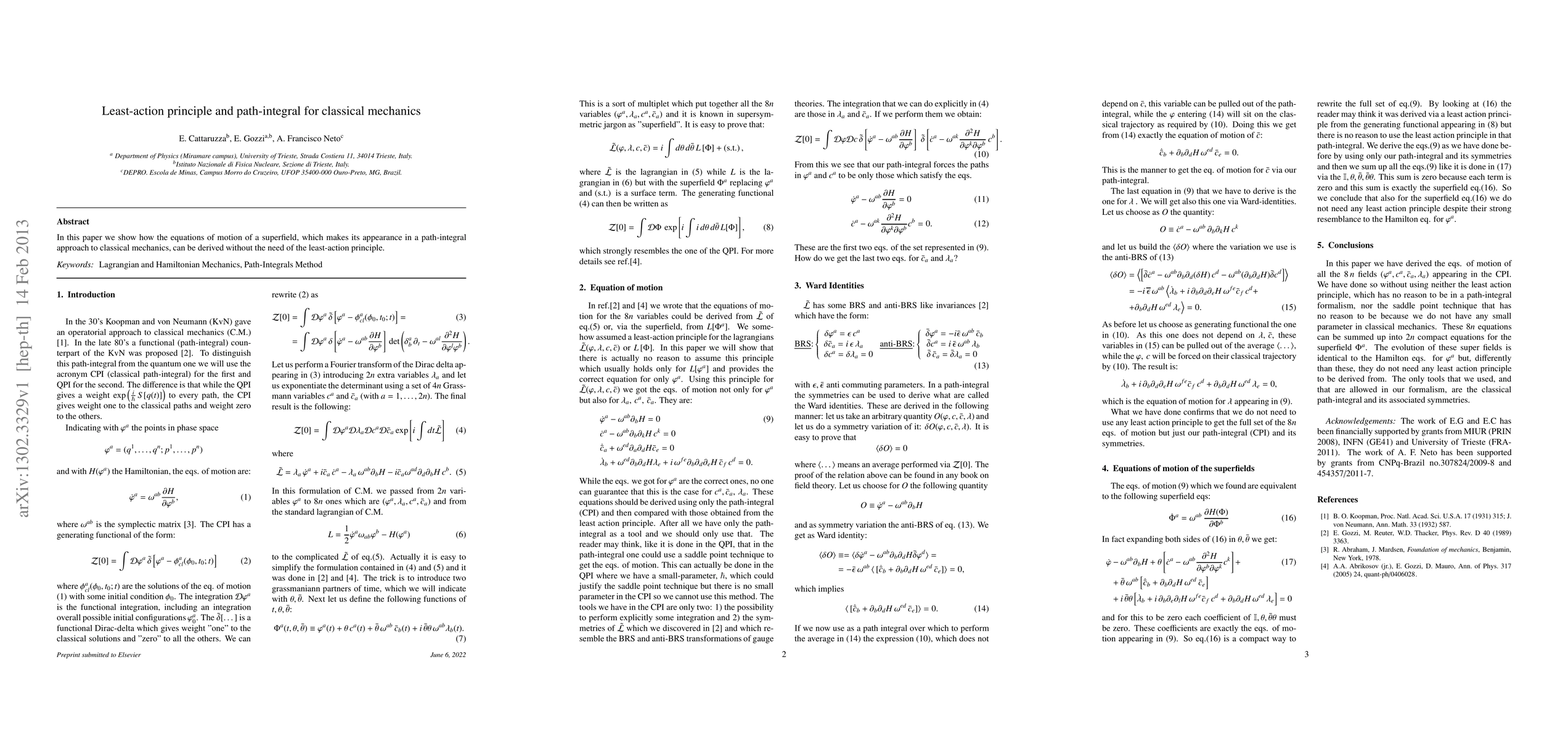 In this paper we show how the equations of motion of a superfield, which makes its appearance in a path-integral approach to classical mechanics, can be derived without the need of the least-action principle