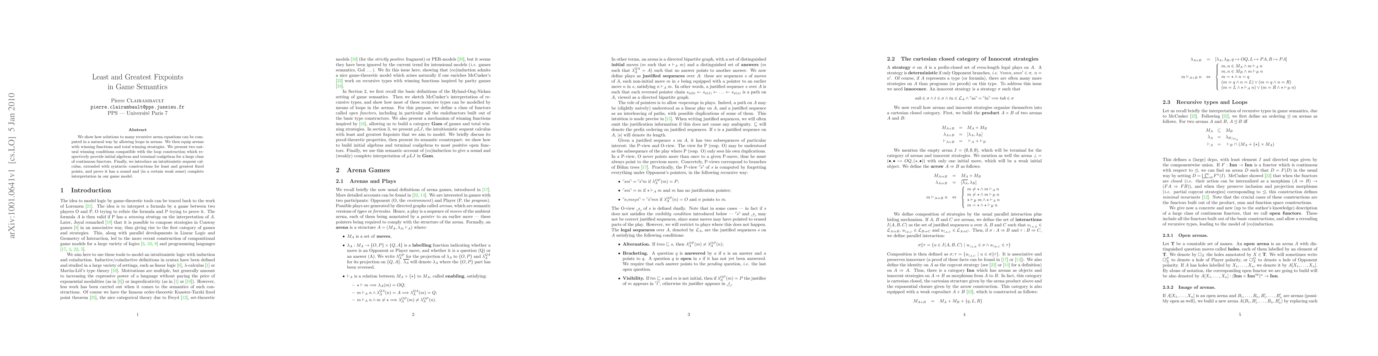 This paper demonstrates how to compute solutions to recursive arena equations using loops, and introduces winning functions and strategies for arenas. It presents two winning conditions that provide initial and terminal coalgebras, and proposes an intuitionistic sequent calculus with fixed point constructs, proving its soundness and weak completeness in the game model.