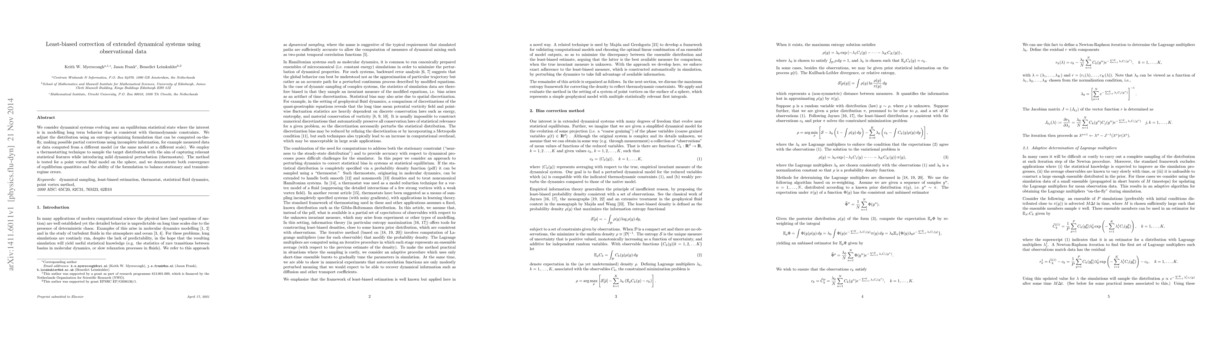 We consider dynamical systems evolving near an equilibrium statistical state where the interest is in modelling long term behavior that is consistent with thermodynamic constraints. We adjust the distribution using an entropy-optimizing formulation that can be computed on-the- fly, making possible partial corrections using incomplete information, for example measured data or data computed from a different model (or the same model at a different scale). We employ a thermostatting technique to sample the target distribution with the aim of capturing relavant statistical features while introducing mild dynamical perturbation (thermostats). The method is tested for a point vortex fluid model on the sphere, and we demonstrate both convergence of equilibrium quantities and the ability of the formulation to balance stationary and transient- regime errors.