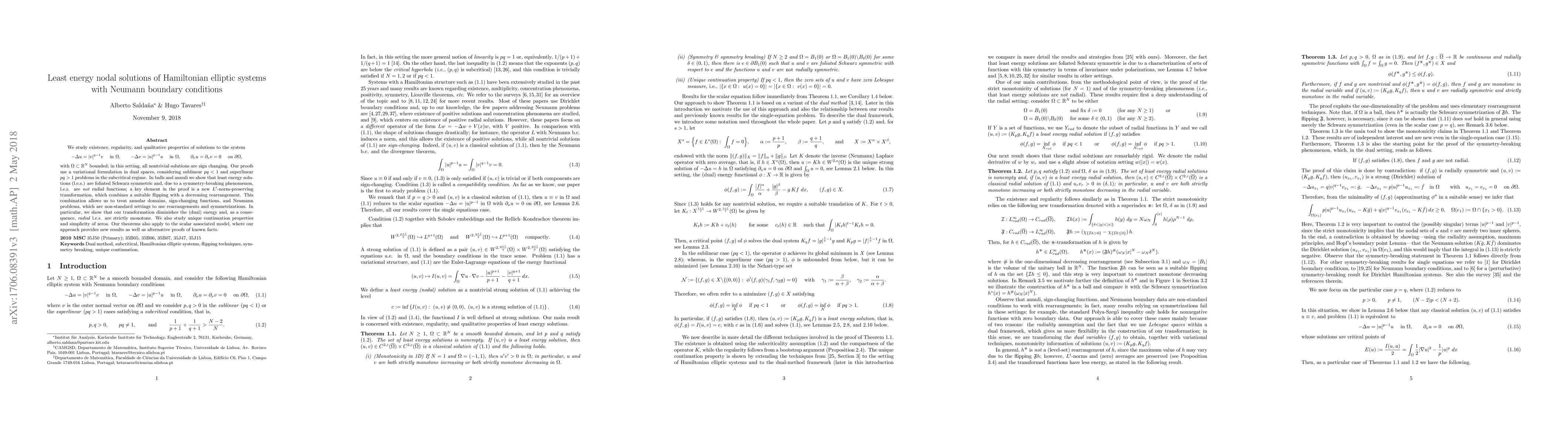 This paper studies Hamiltonian elliptic systems with Neumann boundary conditions, focusing on existence, regularity, and qualitative properties of solutions, including least energy nodal solutions that exhibit symmetry-breaking phenomena.