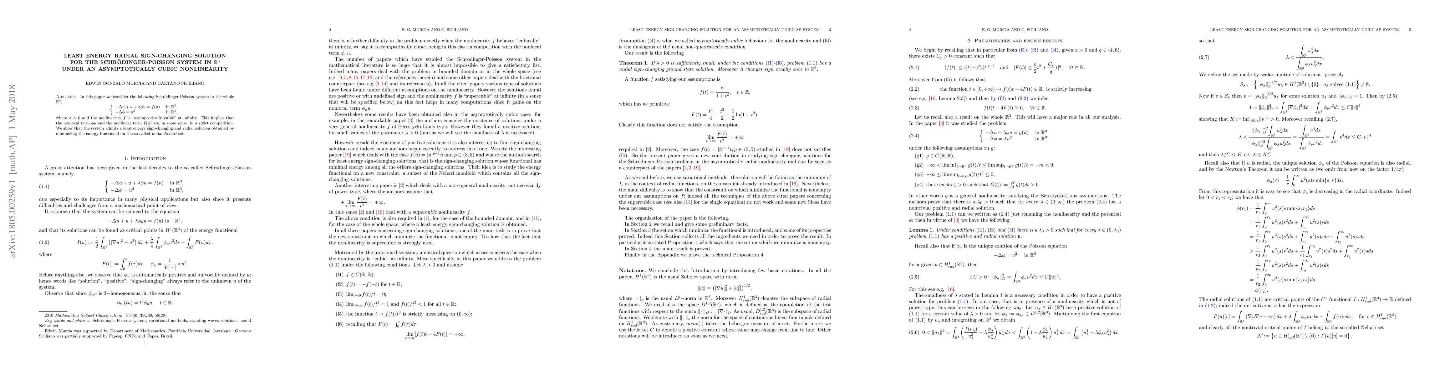 This paper investigates the existence of a least energy radial sign-changing solution for the Schrödinger-Poisson system in $\mathbb{R}^3$ under an asymptotically cubic nonlinearity, proving the existence by minimizing the energy functional on the nodal Nehari set.
