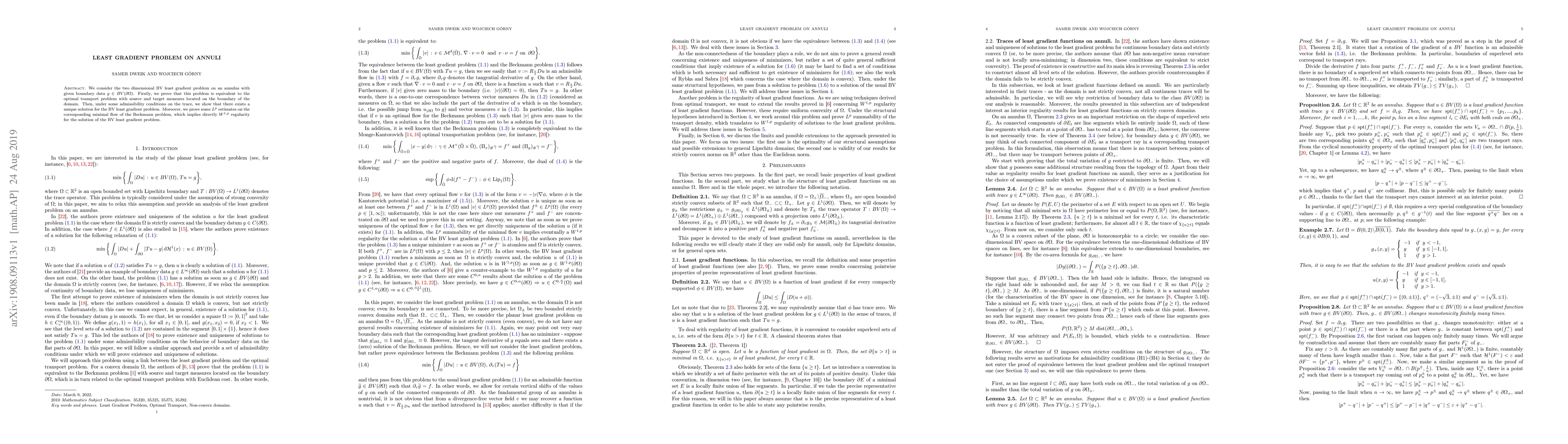 We consider the two dimensional BV least gradient problem on an annulus with given boundary data $g \in BV(\partial\Omega)$. Firstly, we prove that this problem is equivalent to the optimal transport problem with source and target measures located on the boundary of the domain. Then, under some admissibility conditions on the trace, we show that there exists a unique solution for the BV least gradient problem. Moreover, we prove some $L^p$ estimates on the corresponding minimal flow of the Beckmann problem, which implies directly $W^{1,p}$ regularity for the solution of the BV least gradient problem.