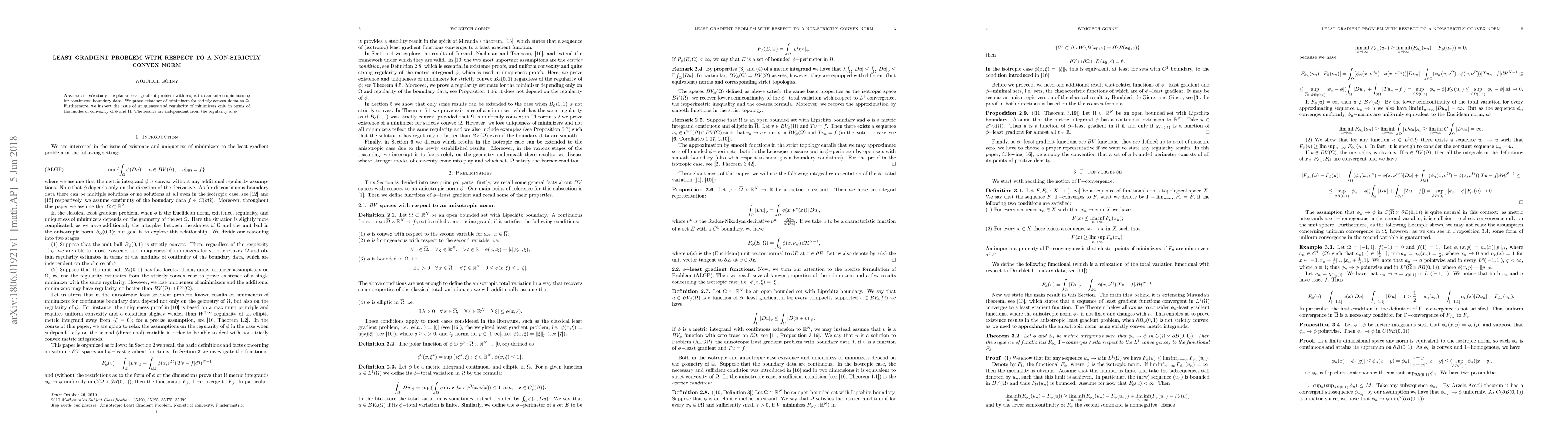 We study the planar least gradient problem with respect to an anisotropic norm $\phi$ for continuous boundary data. We prove existence of minimizers for strictly convex domains $\Omega$. Furthermore, we inspect the issue of uniqueness and regularity of minimizers only in terms of the modes of convexity of $\phi$ and $\Omega$. The results are independent from the regularity of $\phi$.
