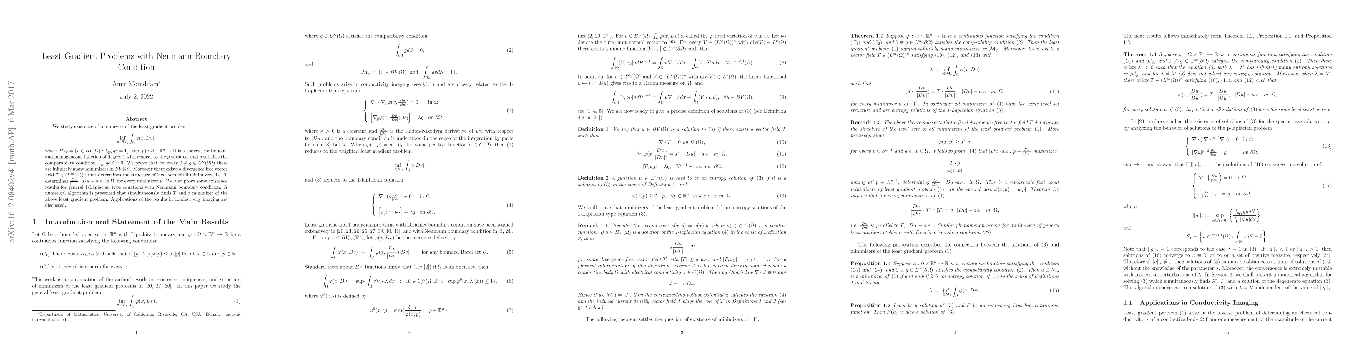 We study existence of minimizers of the least gradient problem \[\inf_{v \in BV_g} \int_{\Omega}\varphi(x, Dv),\] where $BV_g=\{v \in BV(\Omega): \int_{\partial \Omega}gv=1\}$, $\varphi(x,p): \Omega\times \R^n \rightarrow \R$ is a convex, continuous, and homogeneous function of degree $1$ with respect to the $p$ variable, and $g$ satisfies the comparability condition $\int_{\partial \Omega} g dS=0$. We prove that for every $0\not \equiv g \in L^{\infty}(\partial \Omega)$ there are infinitely many minimizers in $BV(\Omega)$. Moreover there exists a divergence free vector field $T\in (L^{\infty}(\Omega))^n$ that determines the structure of level sets of all minimizers, i.e. $T$ determines $\frac{Du}{|Du|}$, $|Du|-$ a.e. in $\Omega$, for every minimizer $u$. We also prove some existence results for general 1-Laplacian type equations with Neumann boundary condition. A numerical algorithm is presented that simultaneously finds $T$ and a minimizer of the above least gradient problem. Applications of the results in conductivity imaging are discussed.