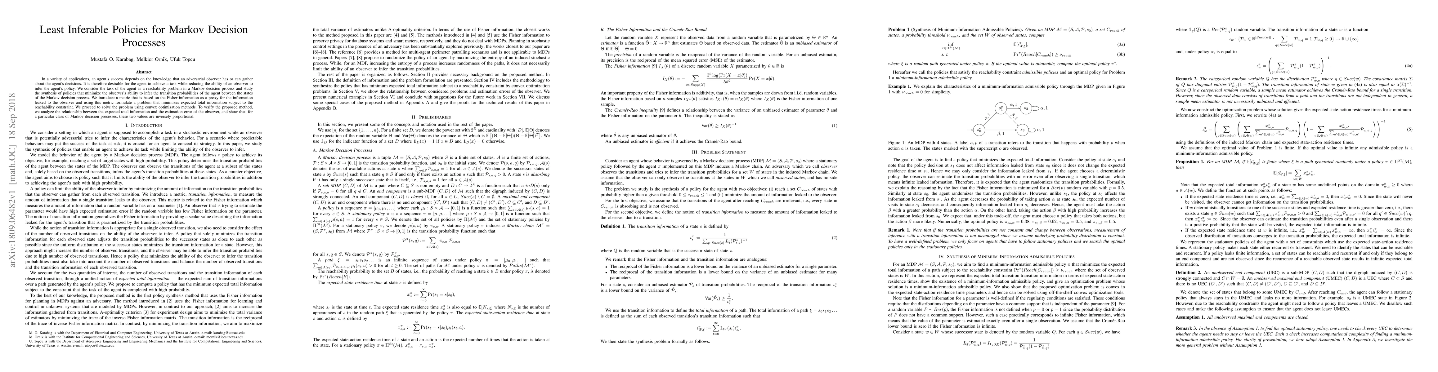 In a variety of applications, an agent's success depends on the knowledge that an adversarial observer has or can gather about the agent's decisions. It is therefore desirable for the agent to achieve a task while reducing the ability of an observer to infer the agent's policy. We consider the task of the agent as a reachability problem in a Markov decision process and study the synthesis of policies that minimize the observer's ability to infer the transition probabilities of the agent between the states of the Markov decision process. We introduce a metric that is based on the Fisher information as a proxy for the information leaked to the observer and using this metric formulate a problem that minimizes expected total information subject to the reachability constraint. We proceed to solve the problem using convex optimization methods. To verify the proposed method, we analyze the relationship between the expected total information and the estimation error of the observer, and show that, for a particular class of Markov decision processes, these two values are inversely proportional.