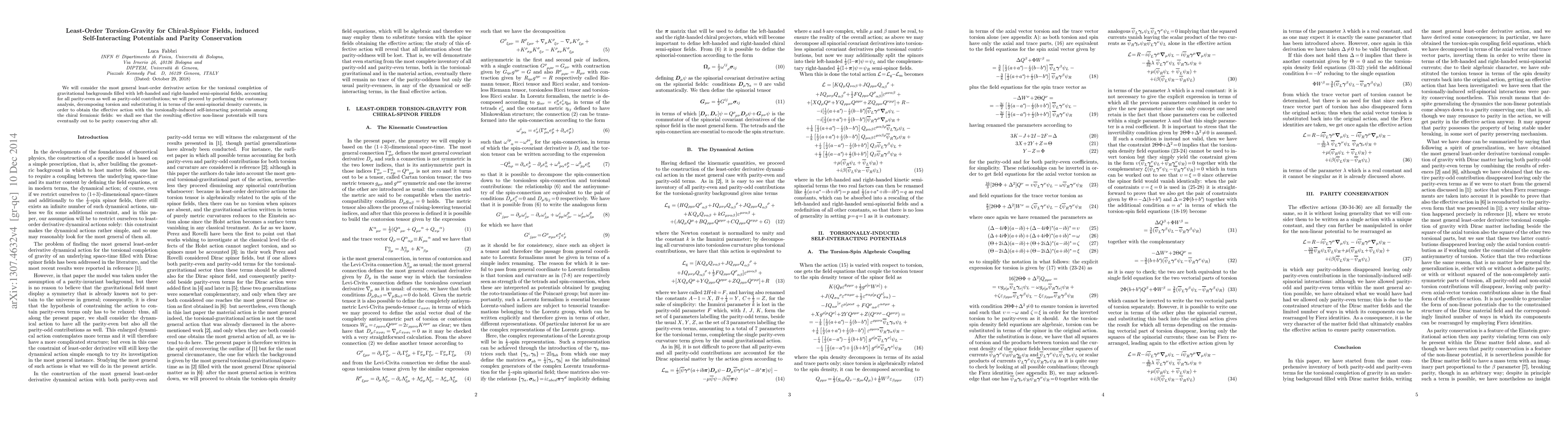 We will consider the most general least-order derivative action for the torsional completion of gravitational backgrounds filled with left-handed and right-handed semi-spinorial fields, accounting for all parity-even as well as parity-odd contributions; we will proceed by performing the customary analysis, decomposing torsion and substituting it in terms of the semi-spinorial density currents, in order to obtain the effective action with the torsionally-induced self-interacting potentials among the chiral fermionic fields: we shall see that the resulting effective non-linear potentials will turn eventually out to be parity conserving after all.
