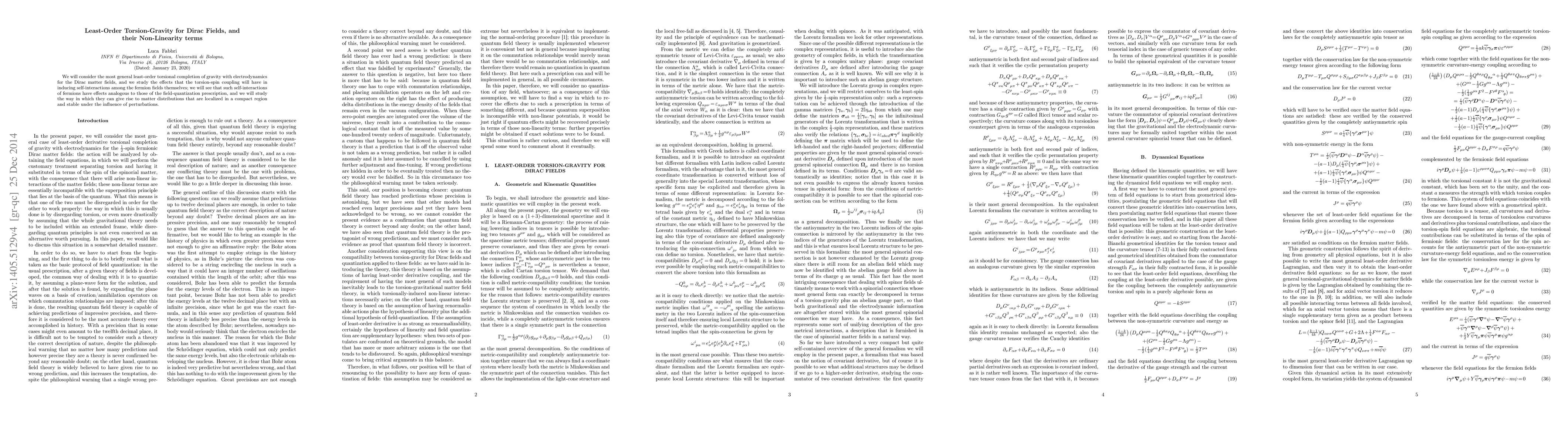 We will consider the most general least-order torsional completion of gravity with electrodynamics for the Dirac matter fields, and we study the effects that the torsion-spin coupling will have in inducing self-interactions among the fermion fields themselves; we will see that such self-interactions of fermions have effects analogous to those of the field-quantization prescription, and we will study the way in which they can give rise to matter distributions that are localized in a compact region and stable under the influence of perturbations.